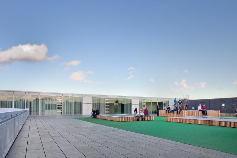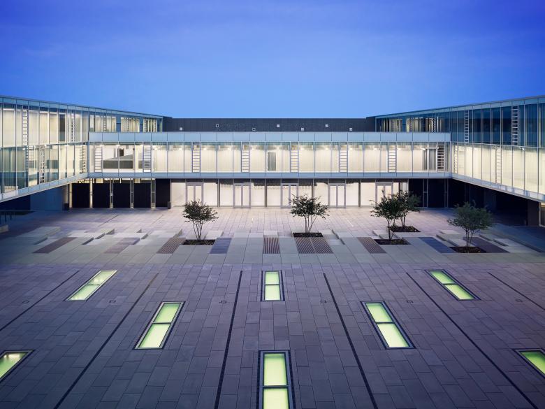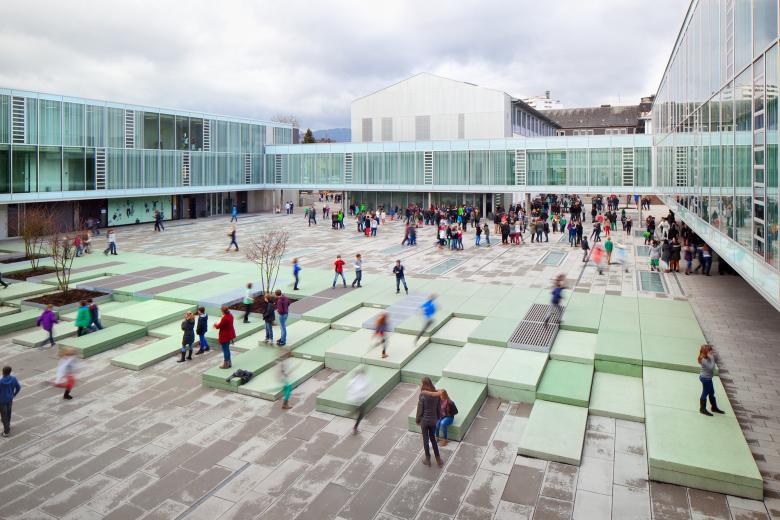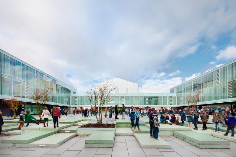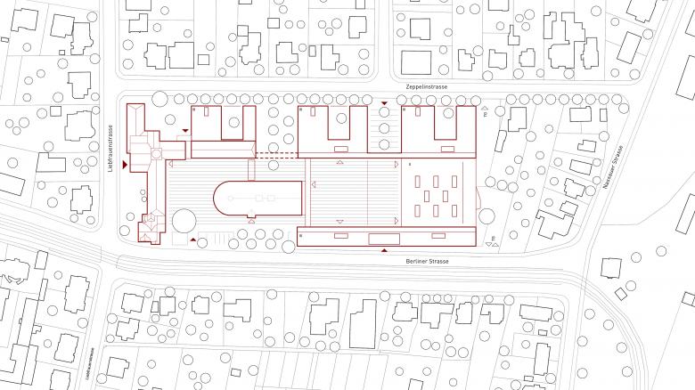 Das städtebauliche Konzept reagiert auf die umliegende Wohnbebauung. Ein zentraler Schulhof bildet die Mitte des Ensembles. Von hier aus werden alle neuen Bauten erschlossen. Im 1. OG verbindet ein umlaufender Erschließungsring die Neubauten barrierefrei mit dem Bestand. Die Blickbeziehung zum zentralen Schulhof ermöglicht eine leichte Orientierung.