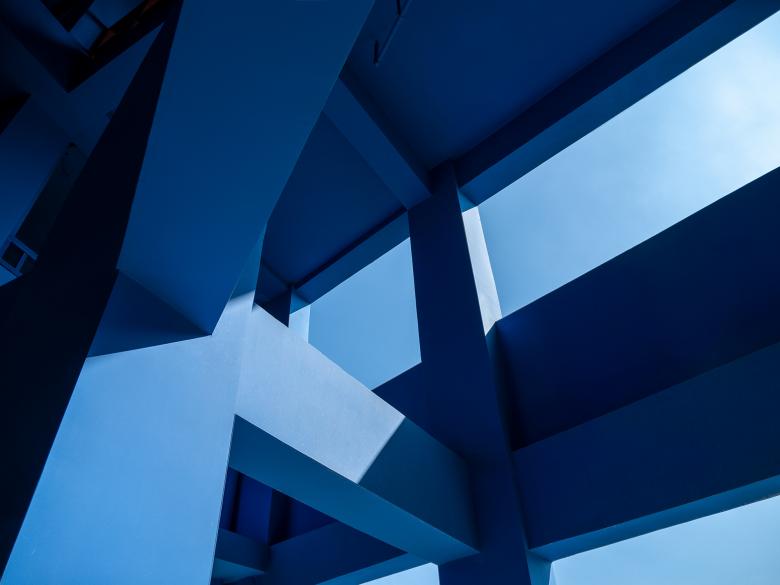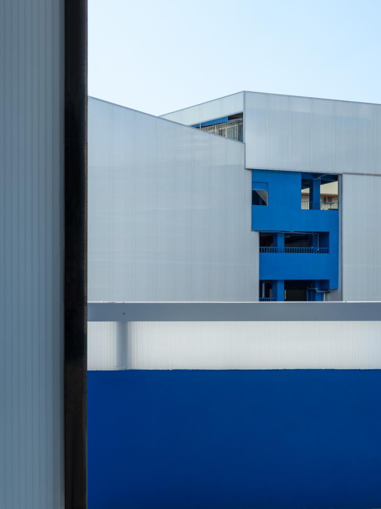 Newly added white materials and structures wrap the original building facades, which reconstruct the building volumes. The white structures form a strong contrast with the new blue wall coatings, together accentuating the neat, bright silhouette unique to the art school.