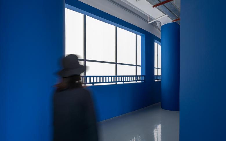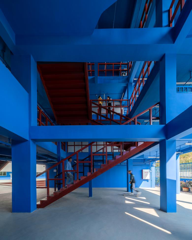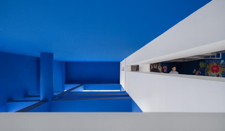 Vivid blue and pure white become a visual identity of the art school. The functional spaces are diversified and flexible, and a series of spacious fluid spaces become an extension of classrooms. Interior structures are finished in blue, while the brownish red stairs clearly highlight the vertical traffic.