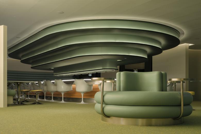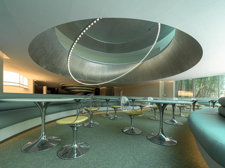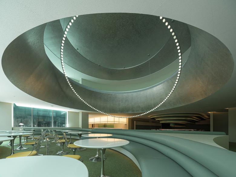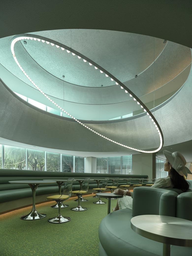Geometric languages such as circle, curve and sphere are applied to interior structures, surfaces and furniture, echoing orbits of planets. By recreating mankind's initial imagined view of the universe, Various Associates produced a streamlined space filled with a comfortable and futuristic ambience.