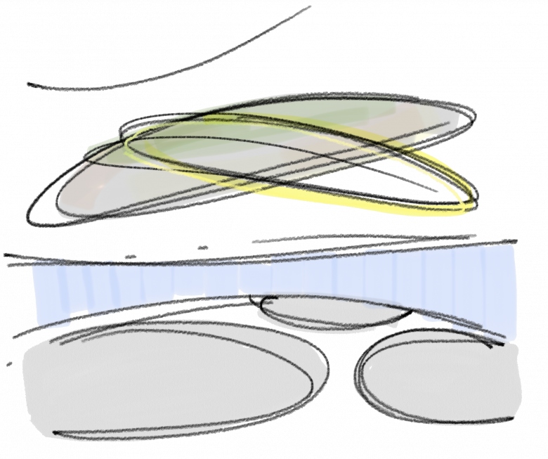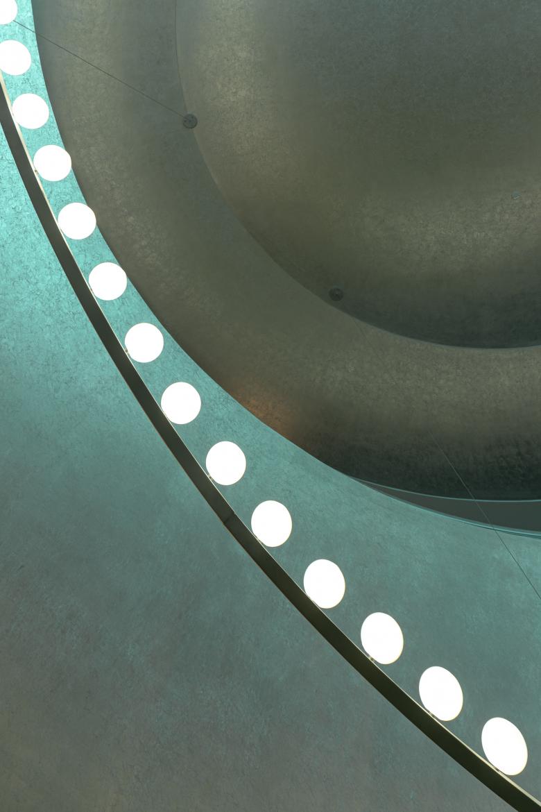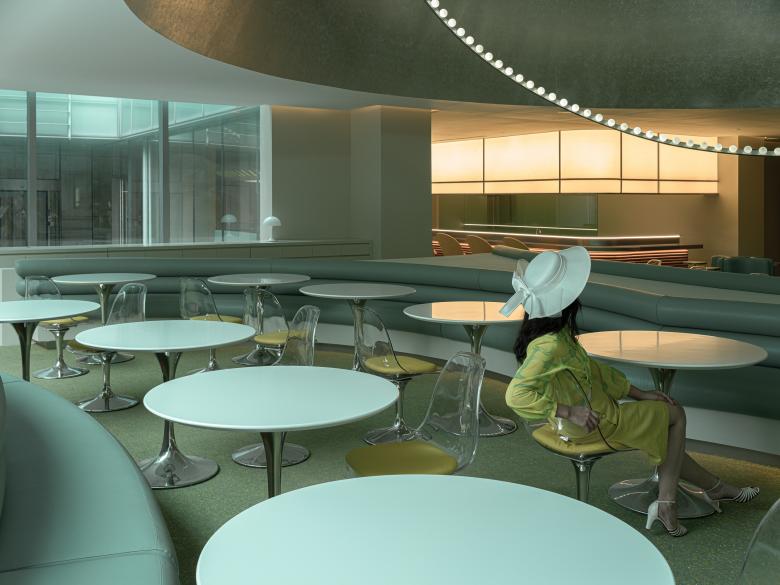 The space is dominated by a greyish green tone, which is a mixture of natural "green" hue and futuristic "grey" colour. Surfaces of different shades, malleable materials, film-like expressions and geometric compositions result in a tactile space.