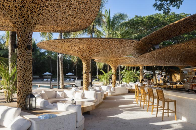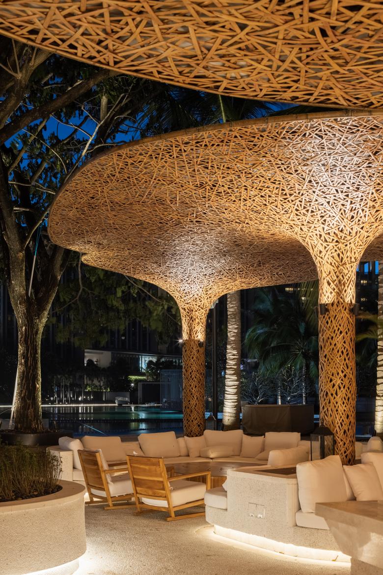 The unique color and texture of bamboo-woven structures are coupled with diffusing light to create a night vibe that the hotel appreciates, and add a touch of romance and warmth to the space.