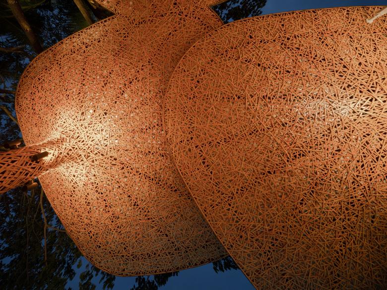 The tightly interwoven bamboo structures allow sunshine to penetrate through in the daytime. When lights are turned on at night, the steel skeleton wrapped in bamboo strips, which stretches like the patterns of a leaf, reveal themselves to the guests, and render the canopy into a giant banana leaf when one looks up, conveying a sense of poetry and revealing the beauty of the structure.