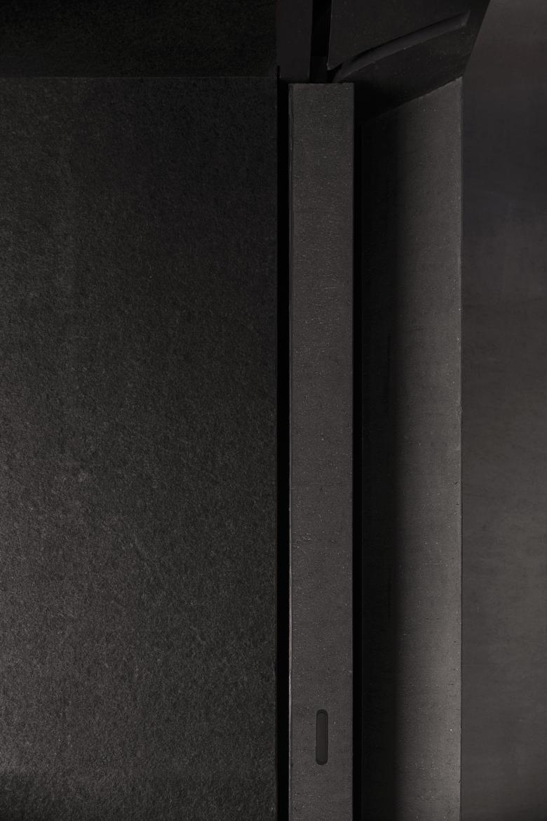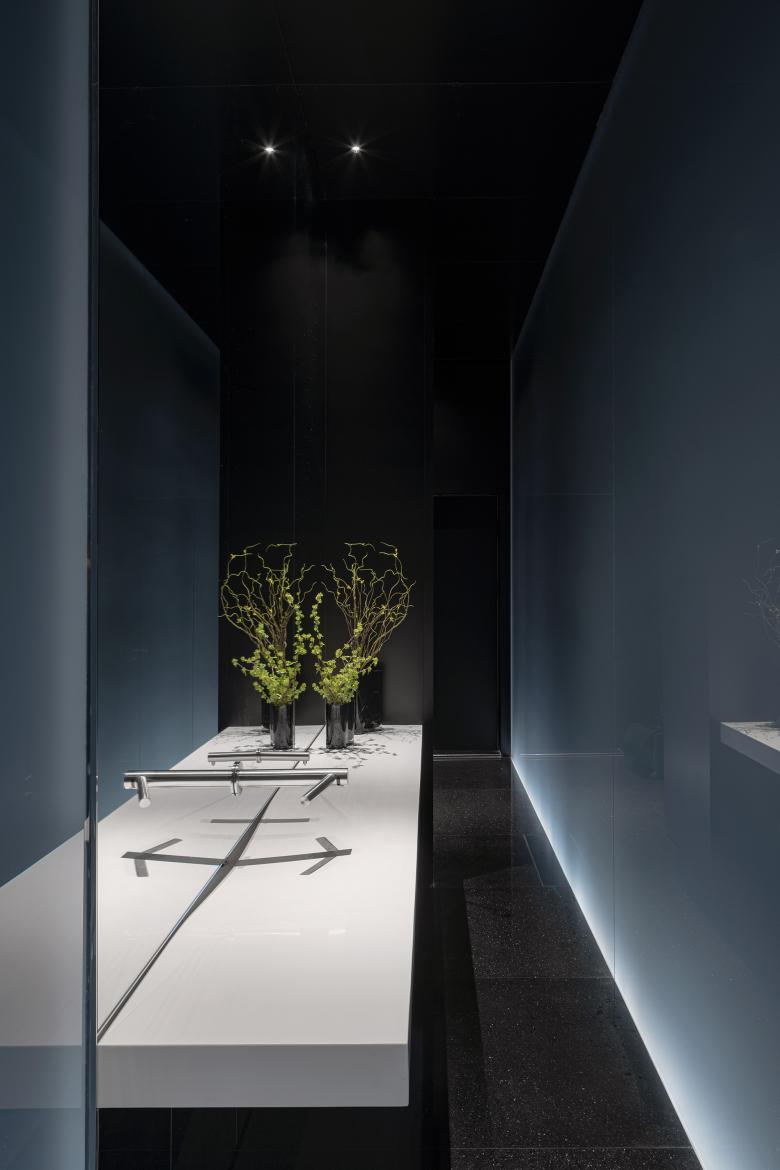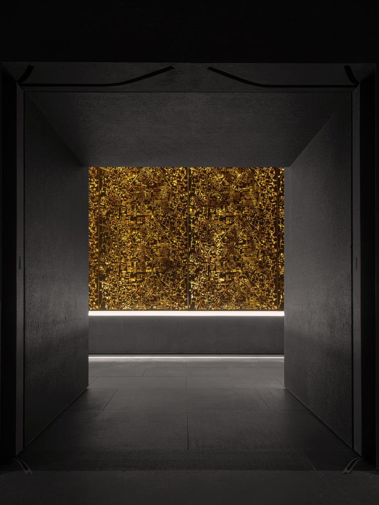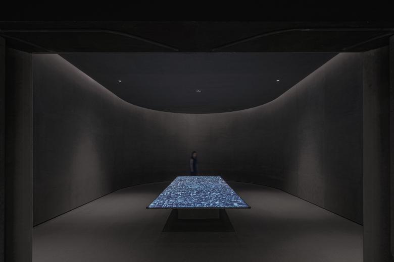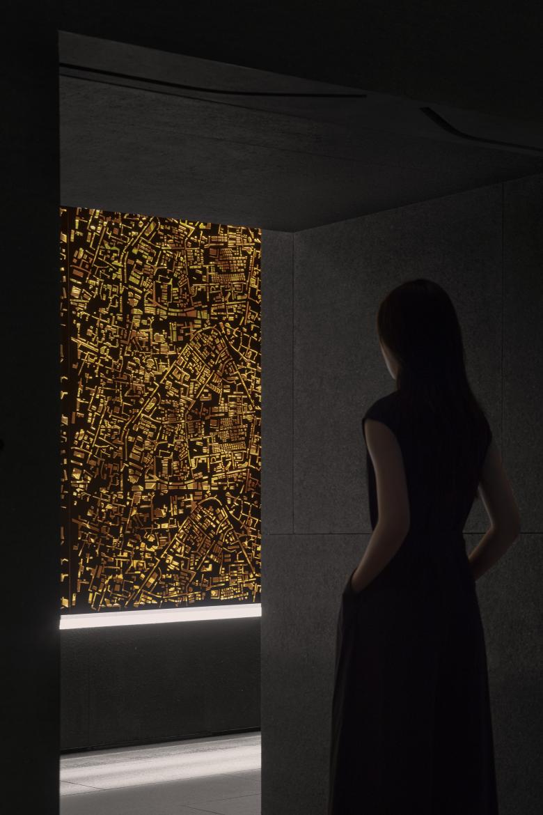 Immediately following the passageway, visitors will reach the first exhibition center, dedicated to narrating stories about the city's past. The design team crafted a sleek and minimalist dark-toned space, placing visitors in a gray area to enhance their perception of colored images depicting the city's history on a suspended platform.