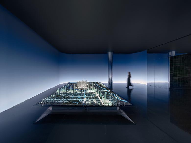 The exhibition center that displays future vision is crafted into an inclusive space. It is designed as a vessel of imagination to showcase the infinite possibilities in the future, with a dynamic backdrop injecting fresh energy into the space.