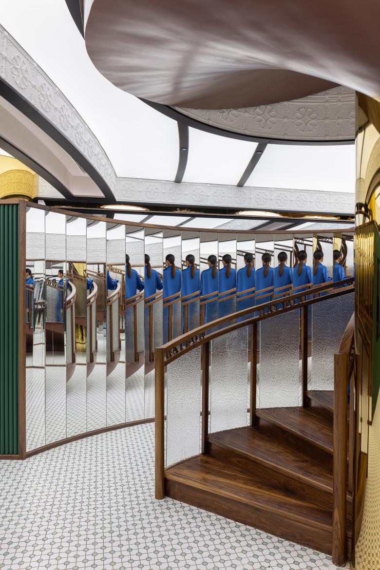 "The retro-style staircase twists upwards, creating dreamy experience in combination with the layers of reflective mirrors. When looking up, a scene of future world comes into view. Past and future seem to interweave here, making people forget about time."