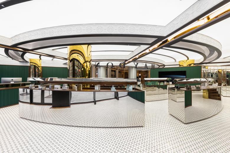 The bespoke embossed gypsum reveals a distinctive Shanghai style. The green and white ceramic tile floor featuring a matrix pattern is reflected on the mirrored stands, showcasing Shanghai style in a more three-dimensional manner and helping balance the visual composition.