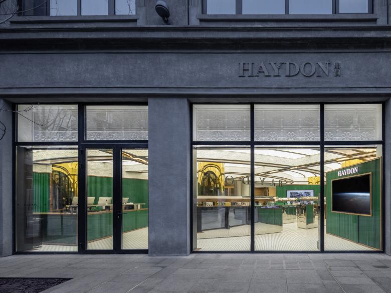 The hollow-out wooden handrail engraved with the brand's logo, the crack-pattern glass and the bespoke carved gypsum are reminiscent of past glorious days. The brand's name HAYDON is presented in the form of wooden carvings or by arranging the characters vertically. The customized white gypsum reliefs and storytelling glass partitions enclose a staircase space that gives a sense of detachment from the outside.