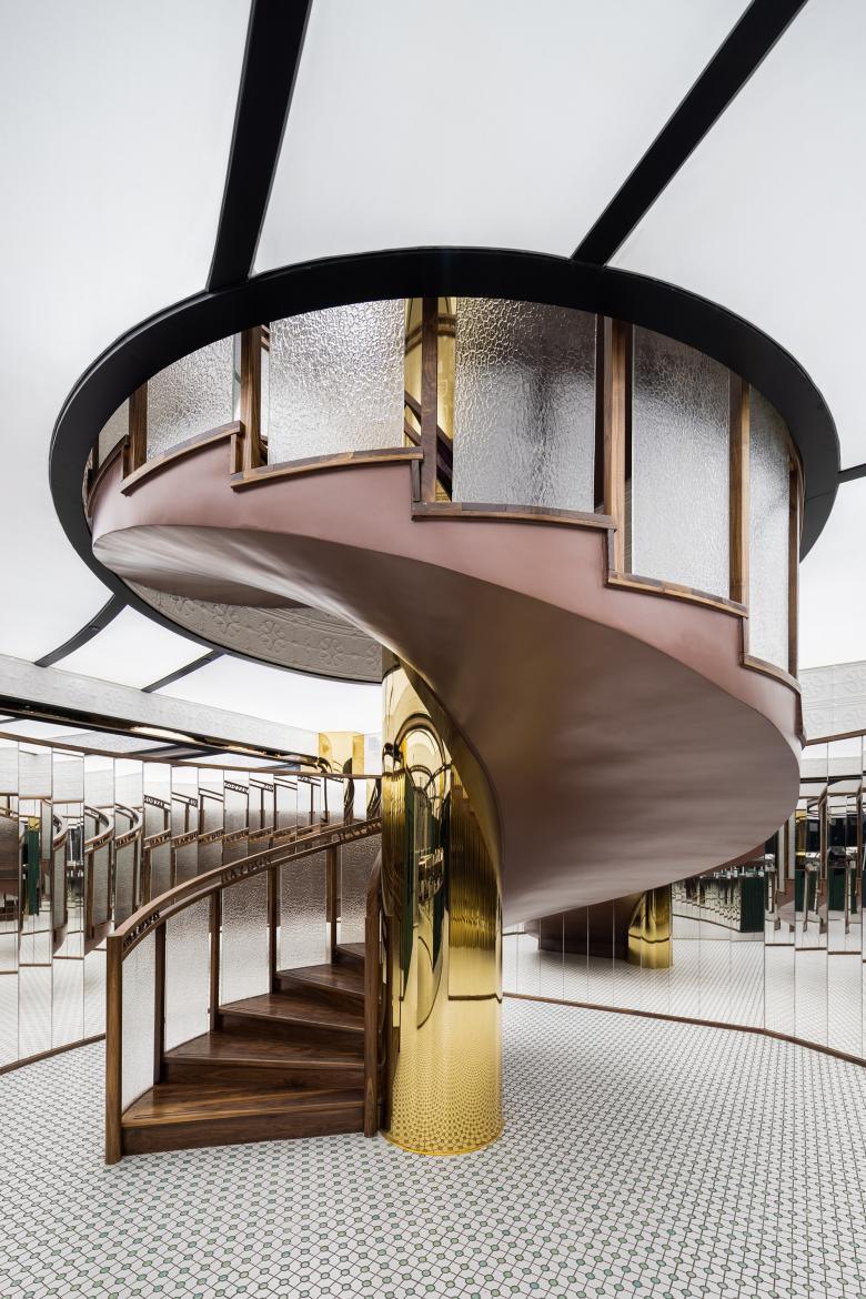 Mirrored surfaces and commodity display arranged in multiple layers, angles and dimensions generate a dream-like magical atmosphere, as if it falls into the time fragment of the past. The dark-toned wooden body of the staircase spirals upwards around a golden reflective round column. Textured glass panels and bespoke wooden handrail featuring hollow-out carvings reveal the perfect match of Shanghai style and Art Deco style.