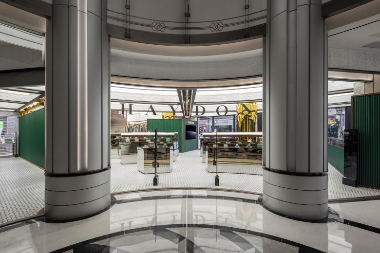 Materials that evoke past memories along with abundant lines help enrich visual layering, break monotony and strengthen the sense of depth of the space. With a limited scale, those elements create infinite fun in the space. HAYDON's logo, outlined by dark tone, is erected at the center of the staircase area on 2F. The brand logo installation slowly revolves around the classical golden column, showing the contrast of retro style and sci-fi and giving a humorous feeling at glance.