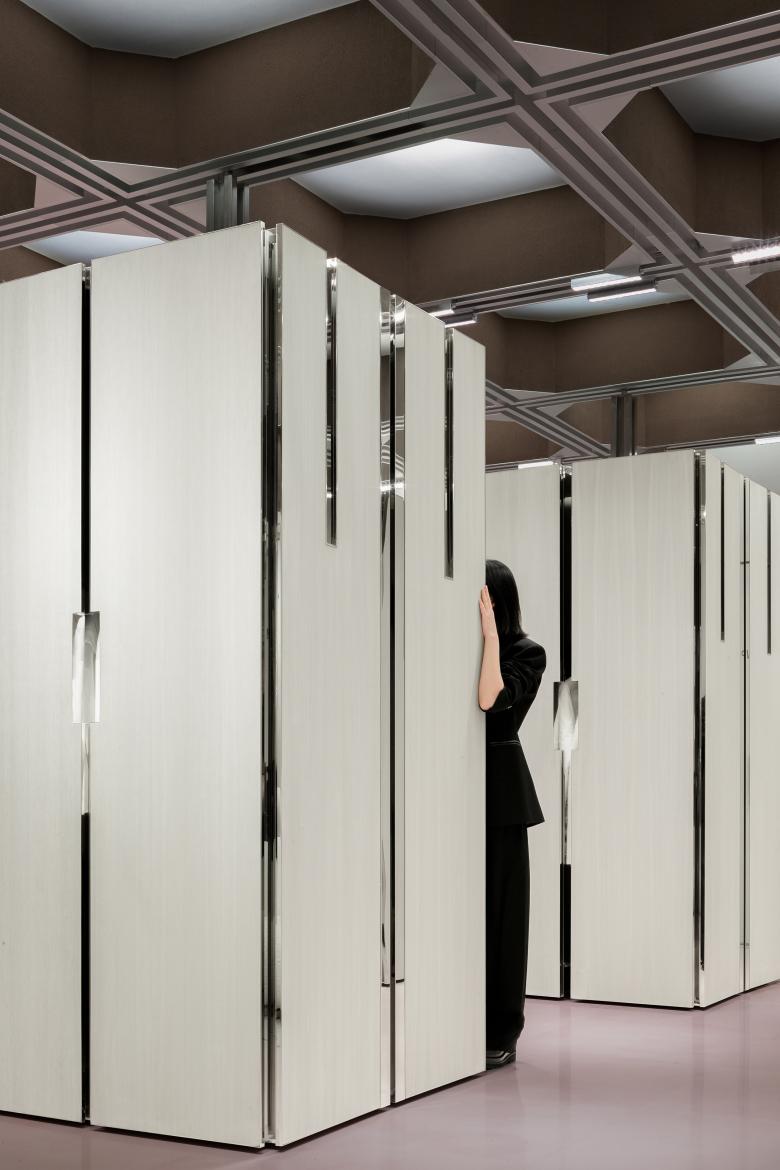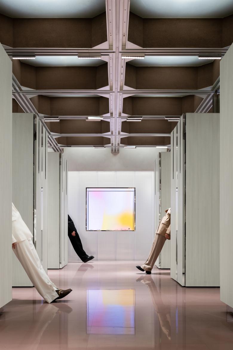 Columns can be moved to the four sides and form an enclosed space at the center. The position of columns can be adjusted to generate different catwalk routes and spatial patterns, so as to meet varying demands for catwalk shows.
