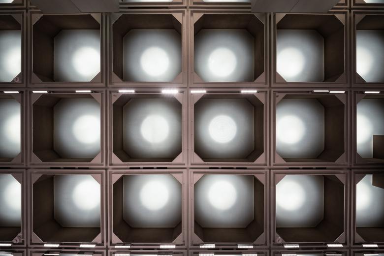 The ceiling is characterized by a sense of order and a structural aesthetic. It hides complex systems behind, including lighting, fire prevention system, and cabinet moving tracks, which are coordinated and integrated into a whole. This area is filled with tranquil shadows and soft lights. It presents an enchanting scene where misty moonlights are reflected on rippling water surface.