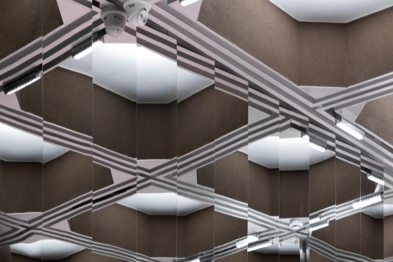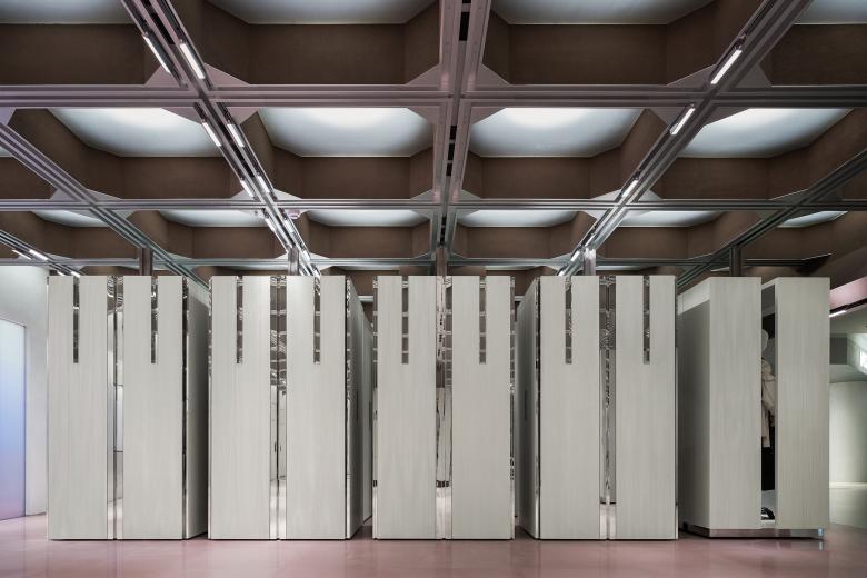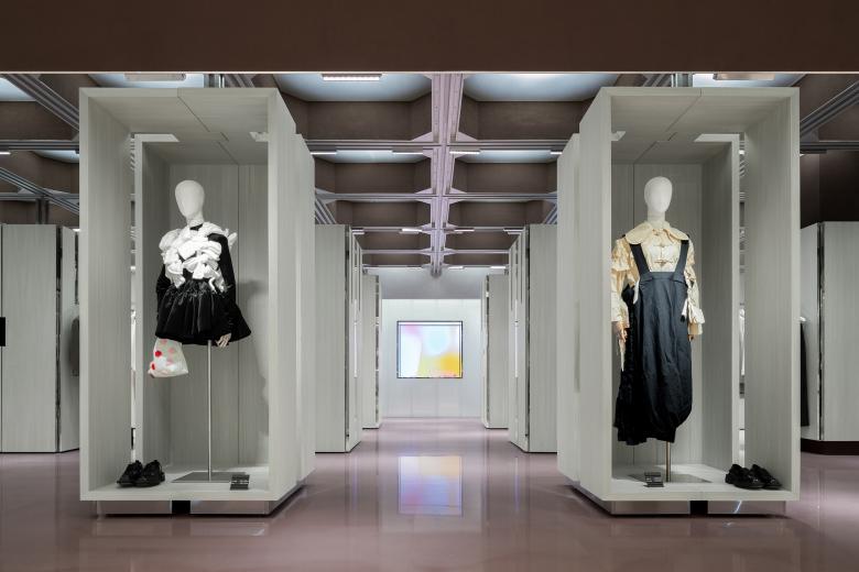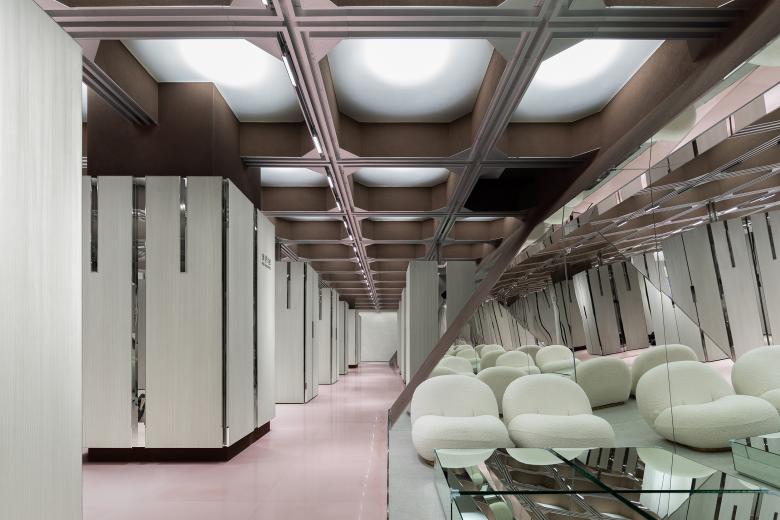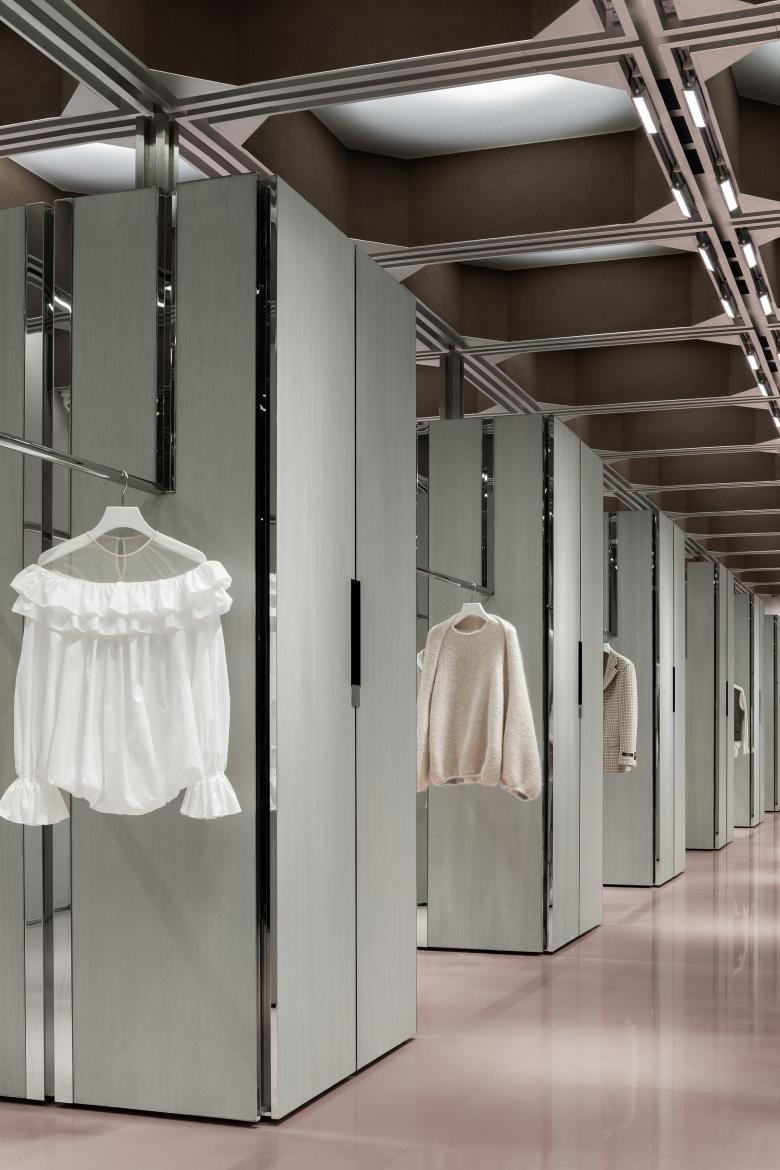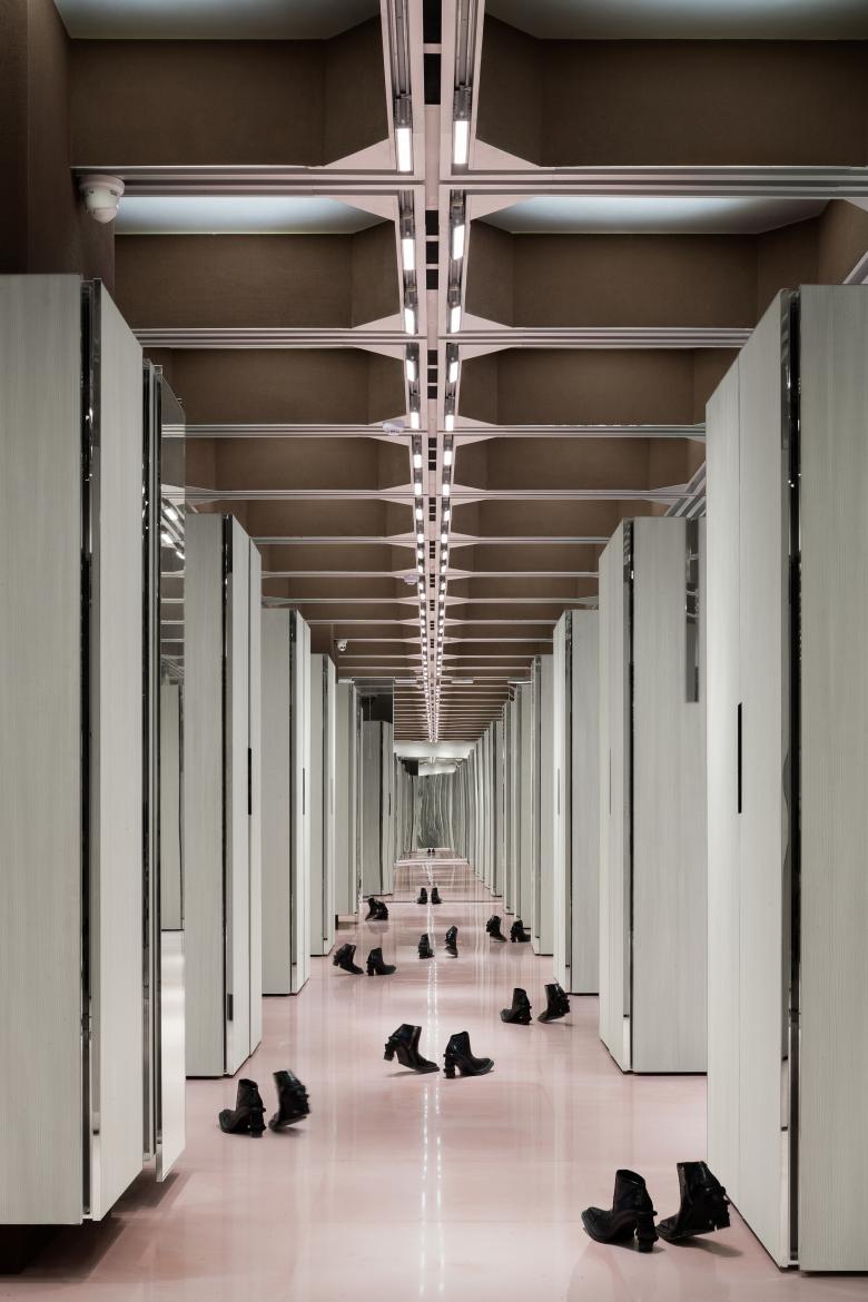 Mirrors at the end of space make customers feel like they're standing in between lofty buildings, and attract them to immerse and indulge in the orderly yet infinite space.