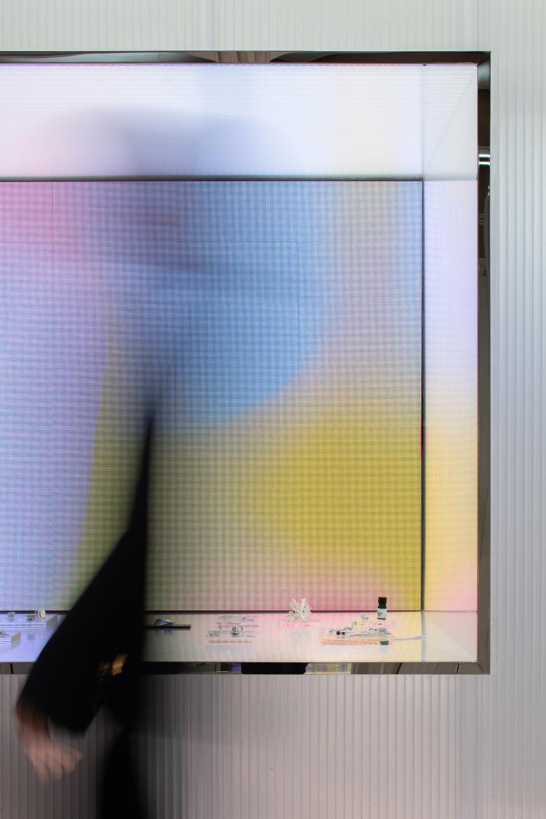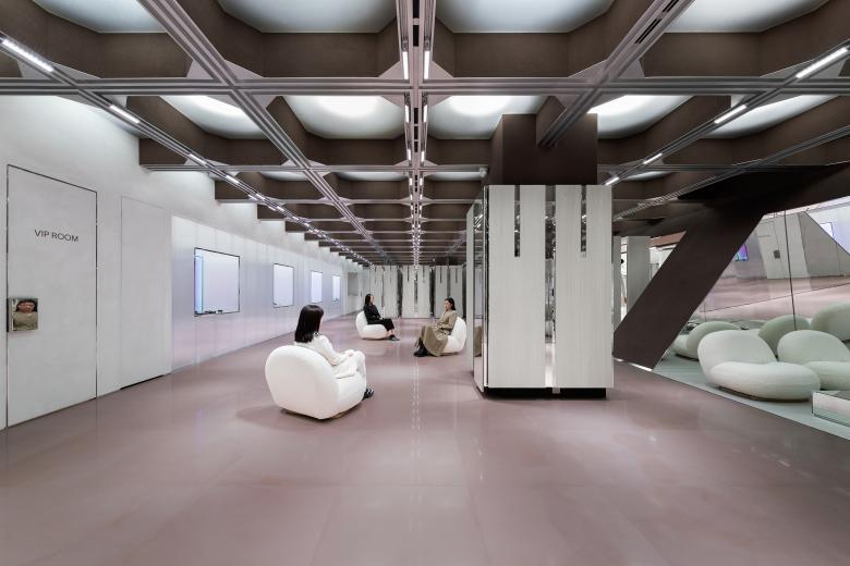 Slanting walls inside the entrance form a leisure and exhibition area that are available to display perfume, artworks and so on. Mirrors reflect the hazy lighting on the ceiling and create a multidimensional dreamy space, which blurs the boundary between the real and the illusionary and provide immersive spatial experiences.