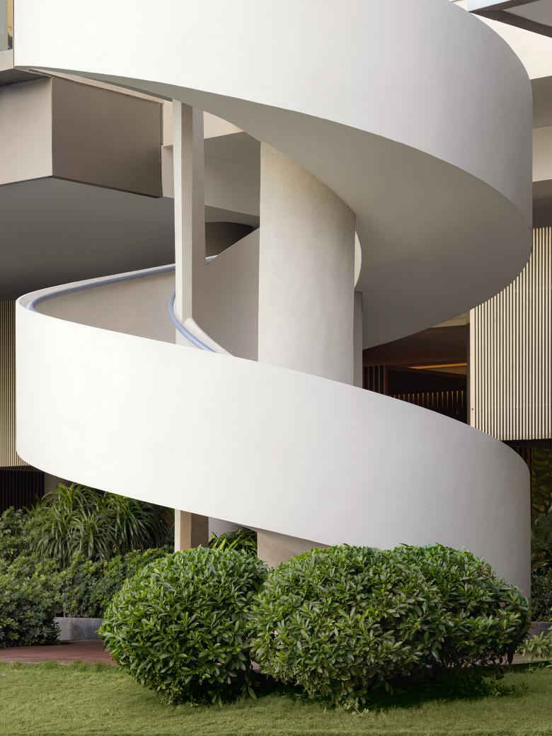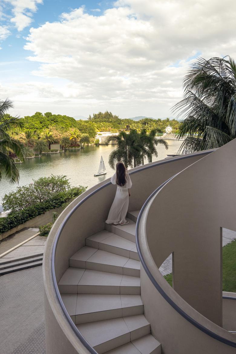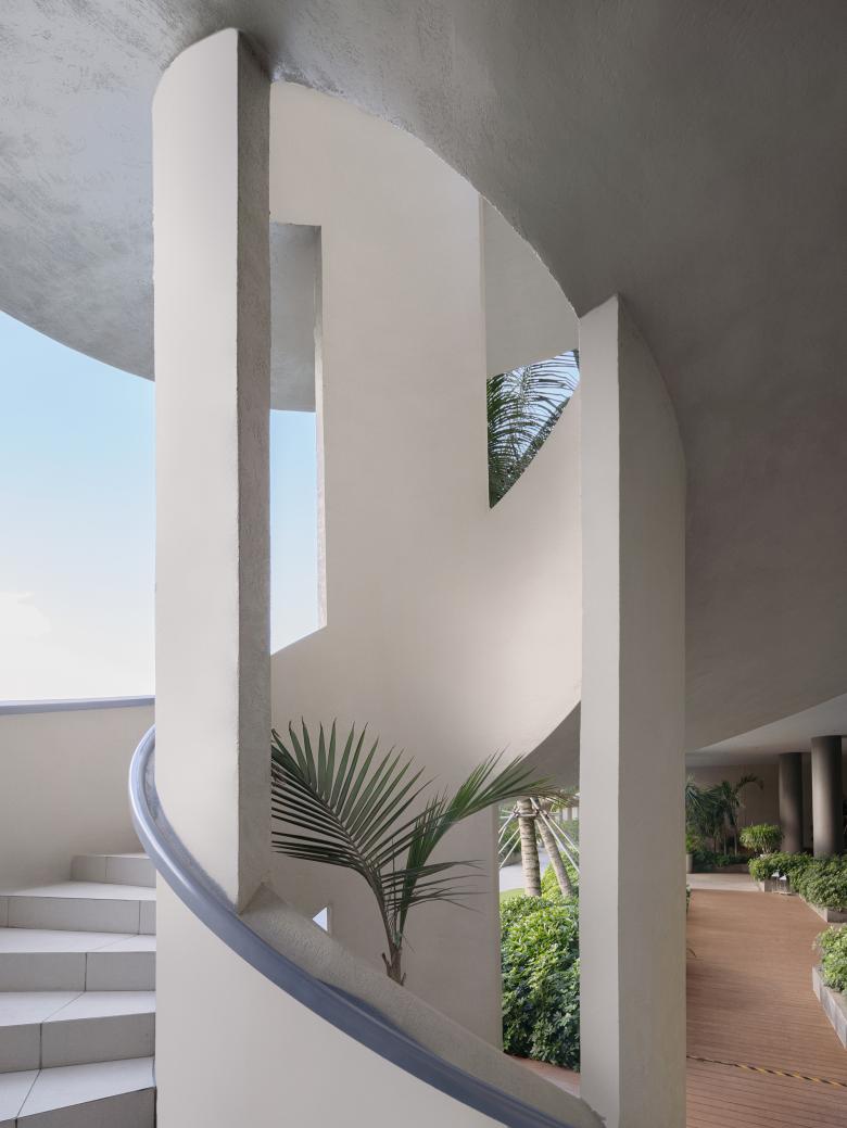 The spiral staircase is crafted with an elegant curved design language, echoing the flair of an art gallery with its pure form. When ascending the pure white steps, visitors are treated to a breathtaking panoramic view of the stunning tropical landscape, making this spot one of the sought-after instagrammable attractions for tourists.