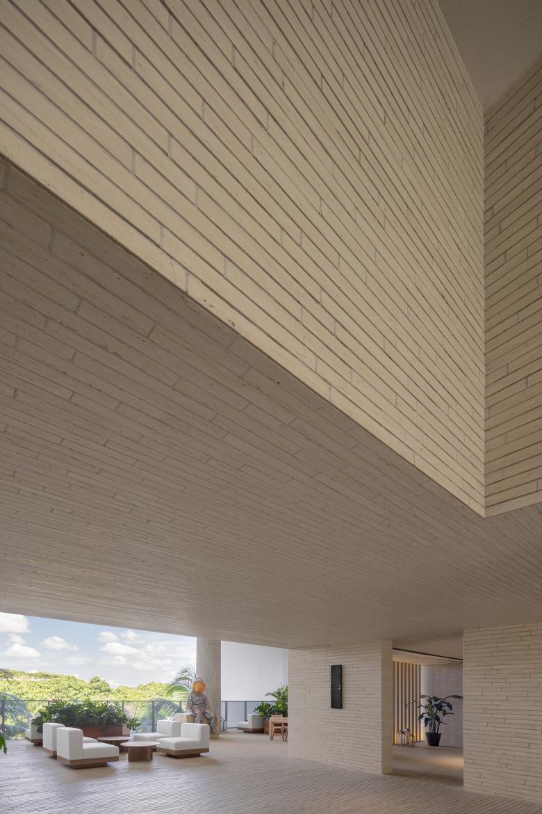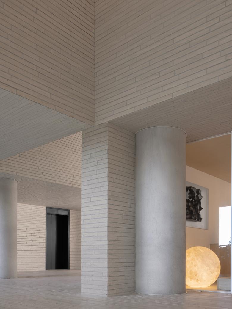 The end of the passageway serves as an intersection of the circulations for the lounge area, elevator hall, and artist-in-residence rooms. The circulations guide the way naturally through height variations, creating a harmonious transition.