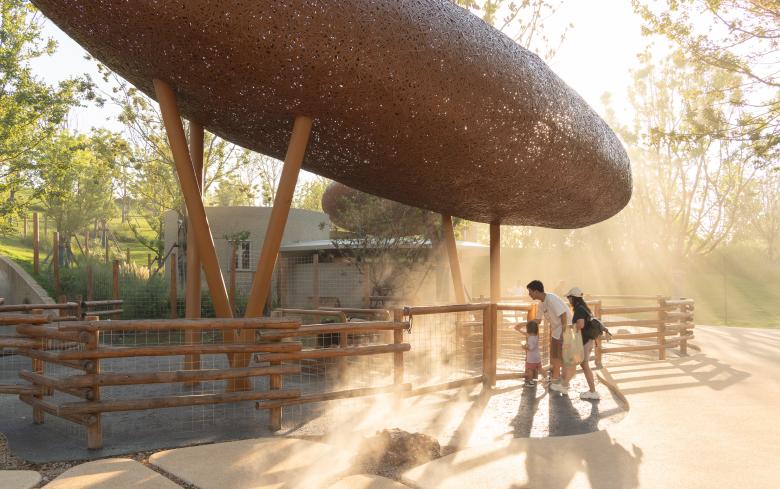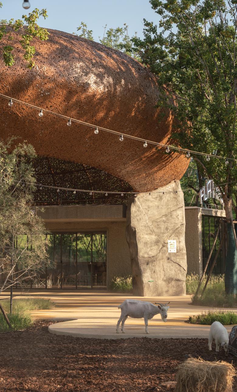 The farm’s circular layout connects animal enclosures, a creative workshop, retail and dining that balances immersive experience with operational efficiency. New structures are embedded into the landscape, creating a continuous visual rhythm across the site. Boulder-like architectural volumes gently emerge from misting systems and native vegetation. Semi-submerged animal enclosures with green roofs reduce the buildings’ visual mass, blending the open farm gently into nature.