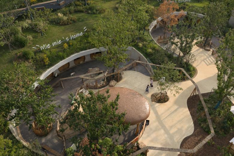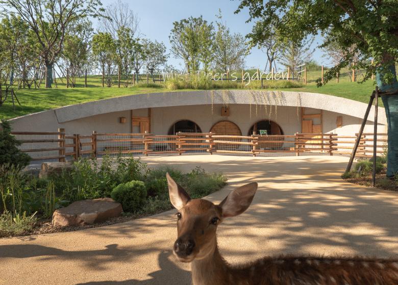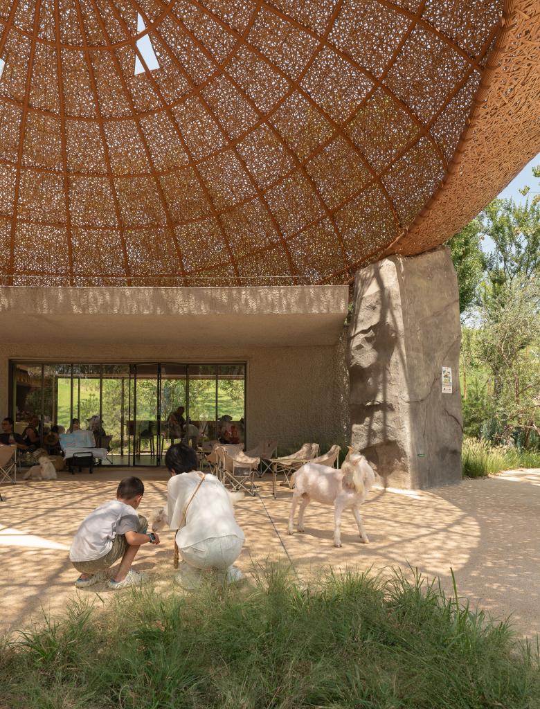 The animal zone blends habitat, interaction, and ecological education, with enclosures, resting pavilions, and coffee and donut shops forming a functional cluster. The low-intervention design tucks enclosures beneath the slopes, minimizing their visual presence. The gentle incline allows animals to roam the grass, while the earth-covered shelters provide safety and comfort.