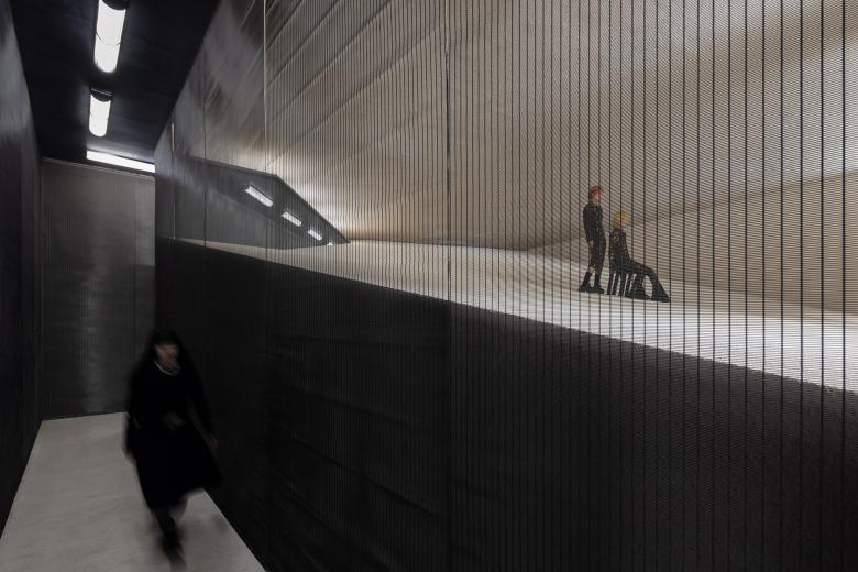 The black path on one side of the dune resembles a deep mine. Bright mining lights illuminate the way and guide explorers to discover hidden treasures beneath the sand. As visitors turn back, the steel grille offers glimpses of the dune's light and shadows.