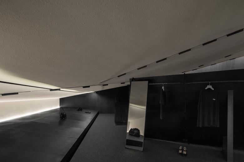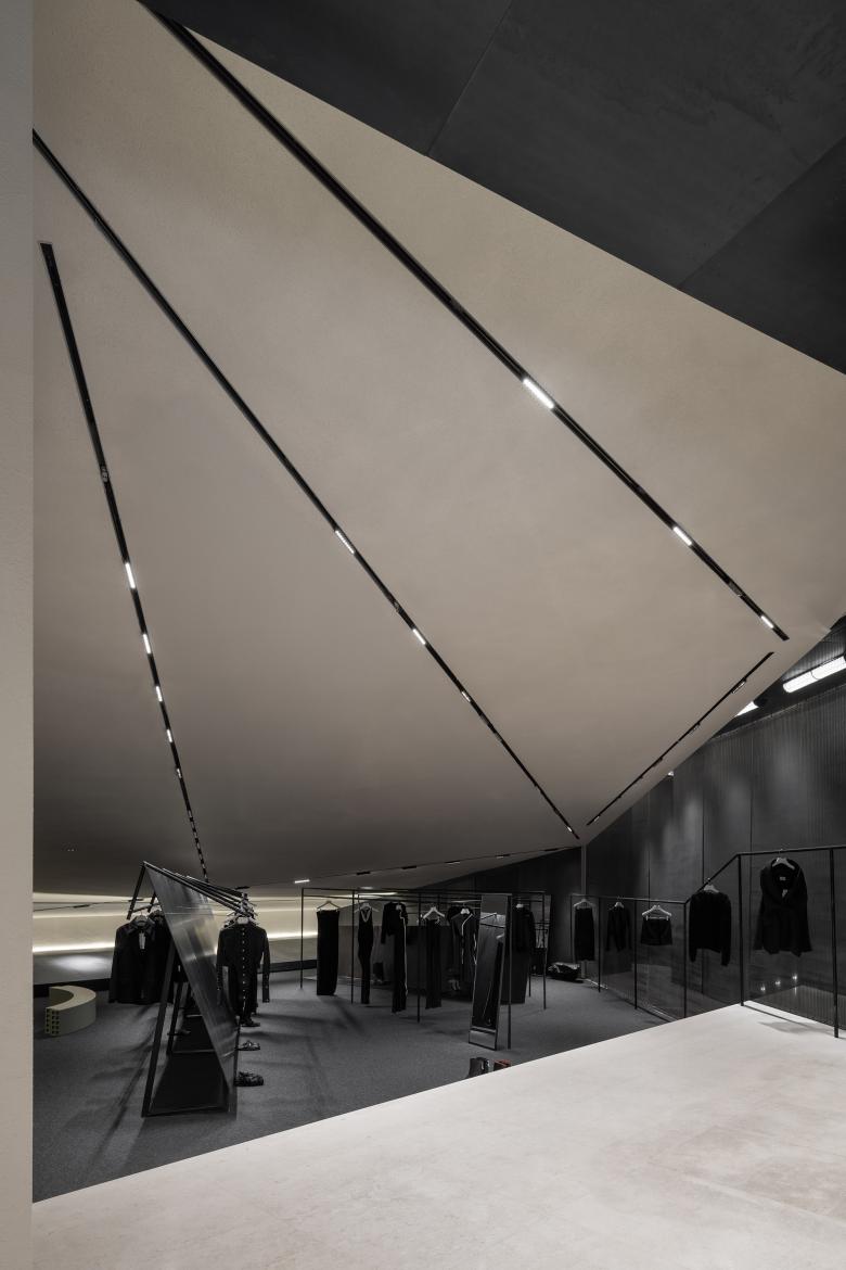 The innovative lighting system brings the black-and-white space to life through the play of light and shadows. Focused lighting accentuates the textures of the fabrics, while diffused lighting reveals the expansive nature of the space. The versatile lighting arrangement creates endless possibilities for the retail space.