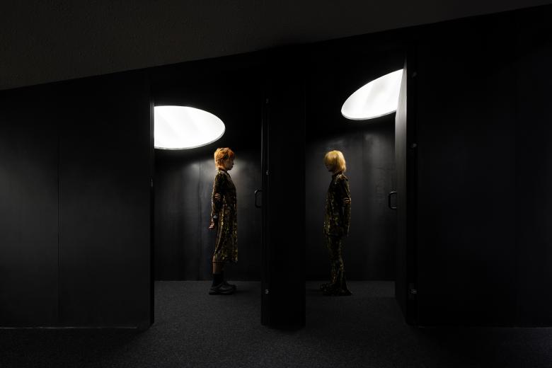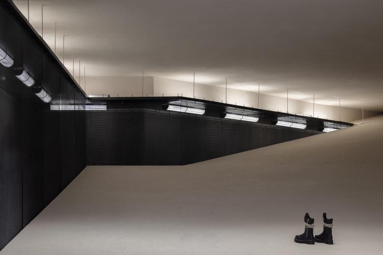 The interplay of bright light and deep shadow creates a sacred and private runway for the fitting rooms located beneath the mountain, as if illuminated in bright moonlight.