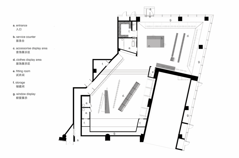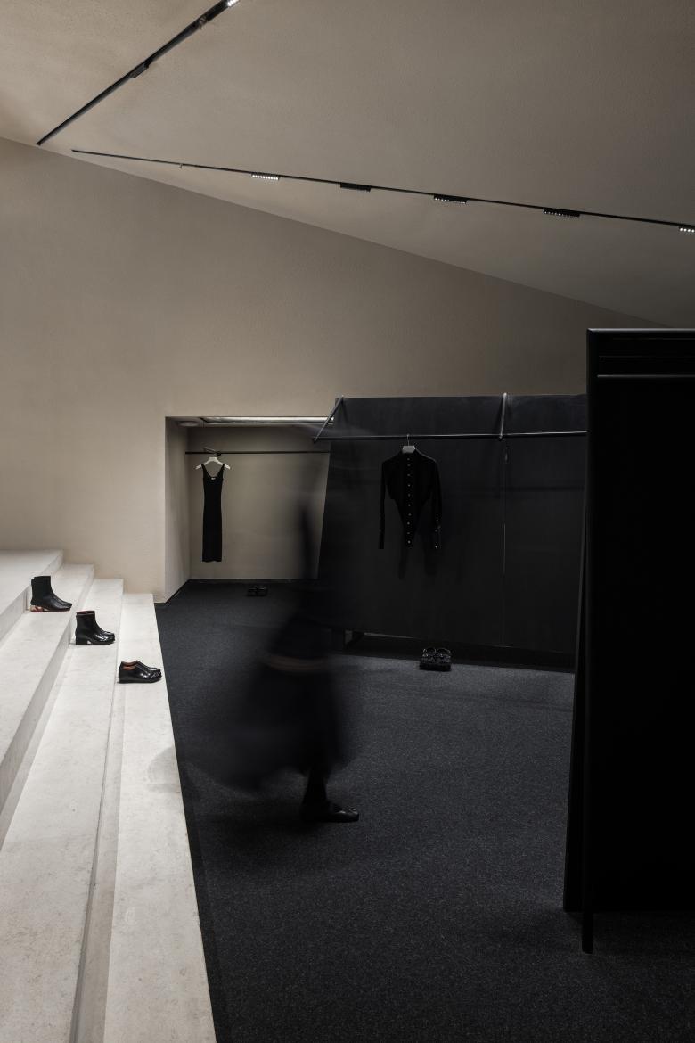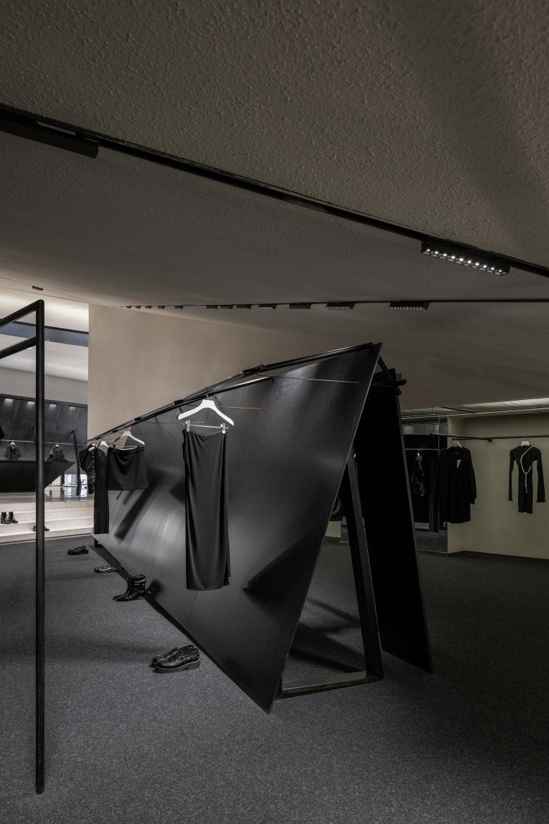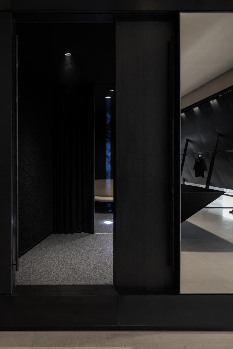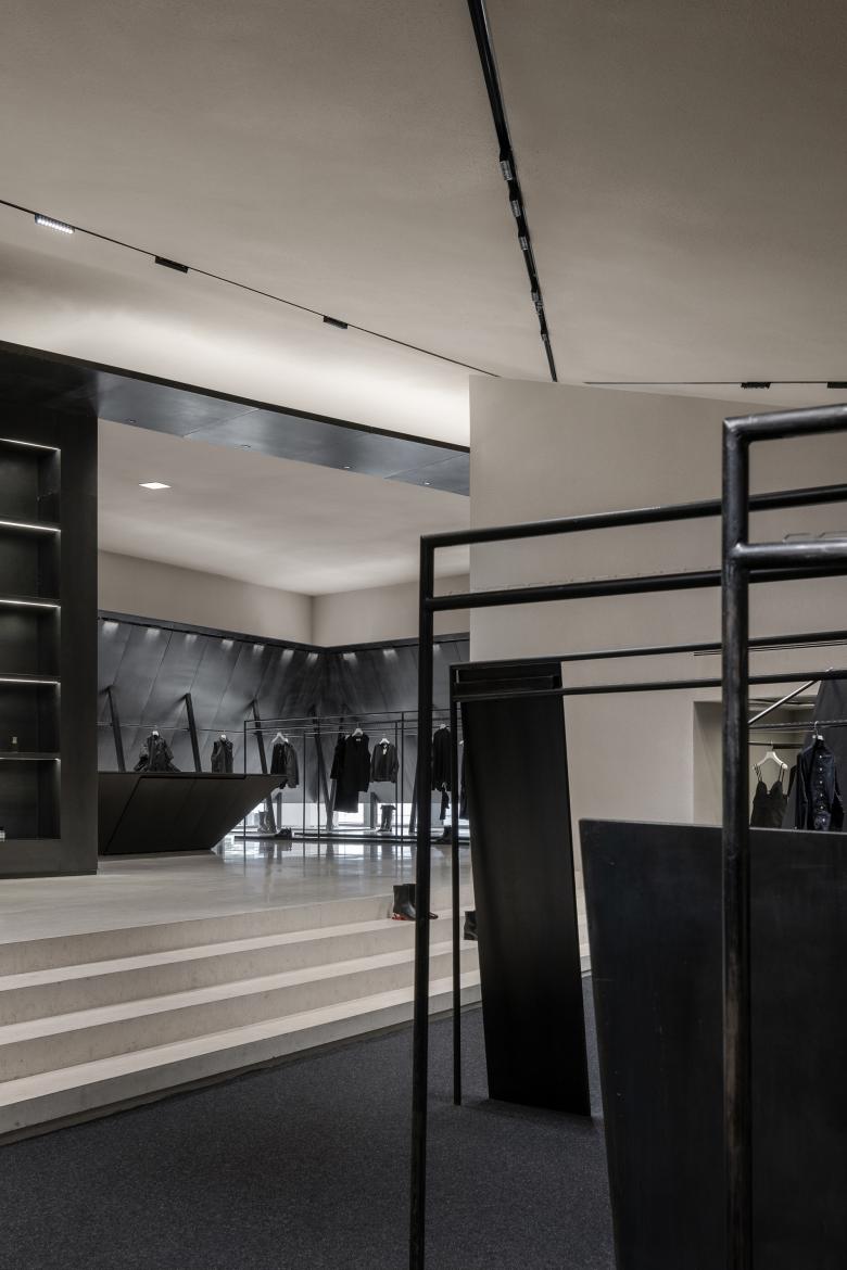The use of iron bars is an extension of the geometric design employed in SND's first store in Chongqing. Display fixtures inspired by raw iron materials are placed throughout the space, creating a striking contrast between black metal and the quiet color backdrop. The use of organic, non-square shapes generates a dynamic tension within the monochrome space, achieving a balance between power and aesthetics.