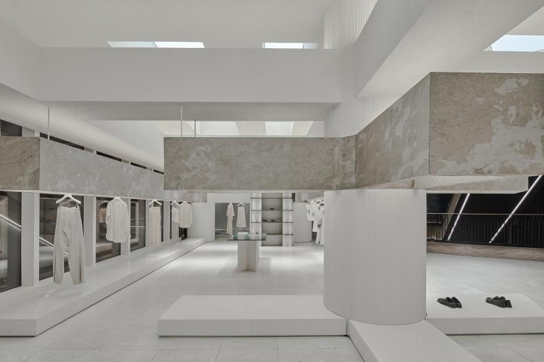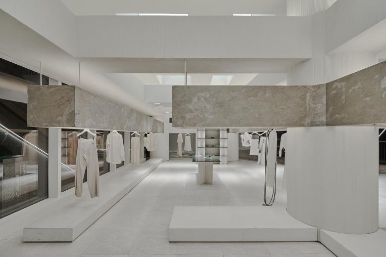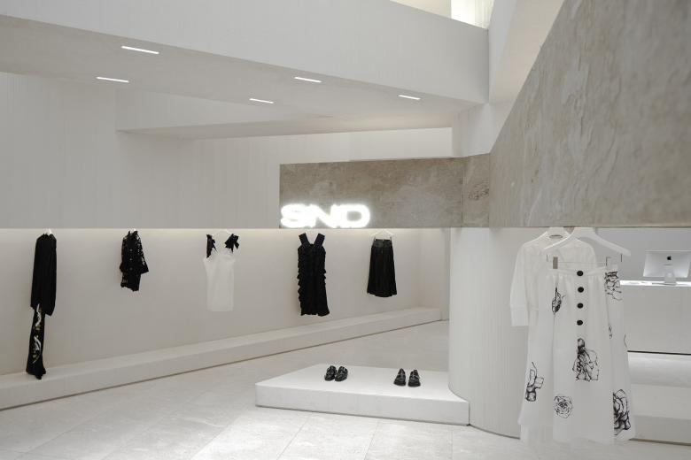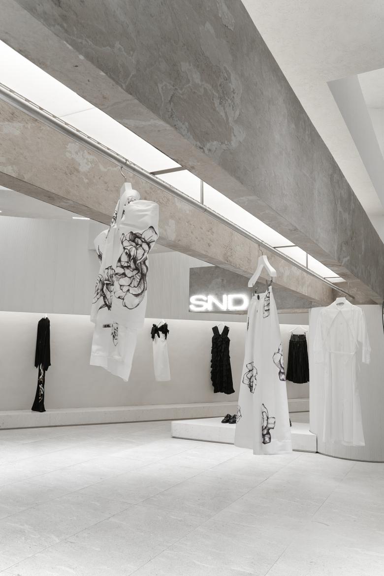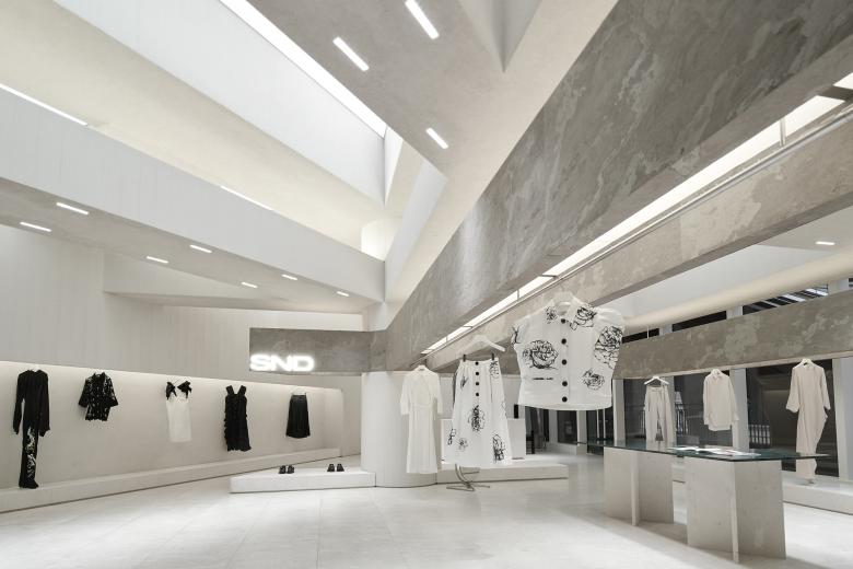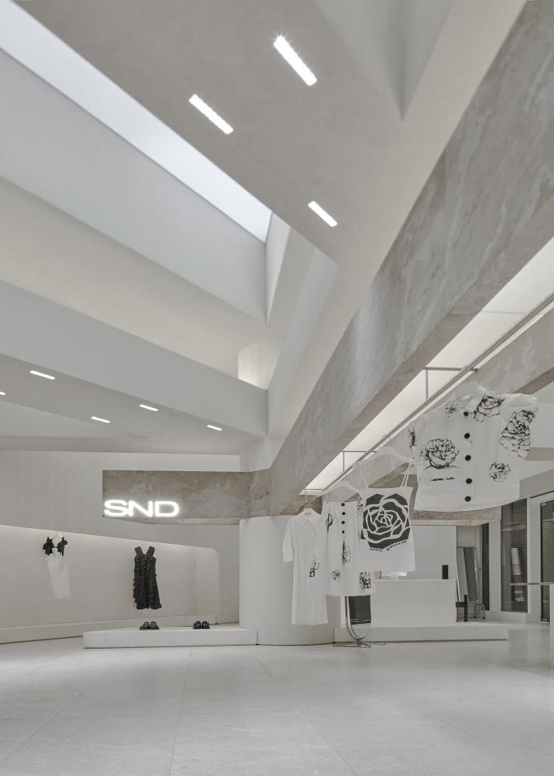 Occupying about 136 square meters, the site is cramped for a boutique fashion store that introduces products from several hundreds of brands. The ceiling height of the original space was relatively favorable. The store needs to be open to the shopping center inside and the windows facing the outside. Based on the site's conditions, Various Associates intended to create a space featuring a sense of layering, architecture and artistry, to continue the genes of other stores they conceived for SND. For that purpose, the design team created several layers of suspended beams in the space, which was inspired by the weathered rough textures and broken aesthetics of ancient temples in deserts. The simple but powerful structural relations on horizontal and vertical levels ensure the transparency of the space, and also strength its sense of depth and the priority system for commodities display.