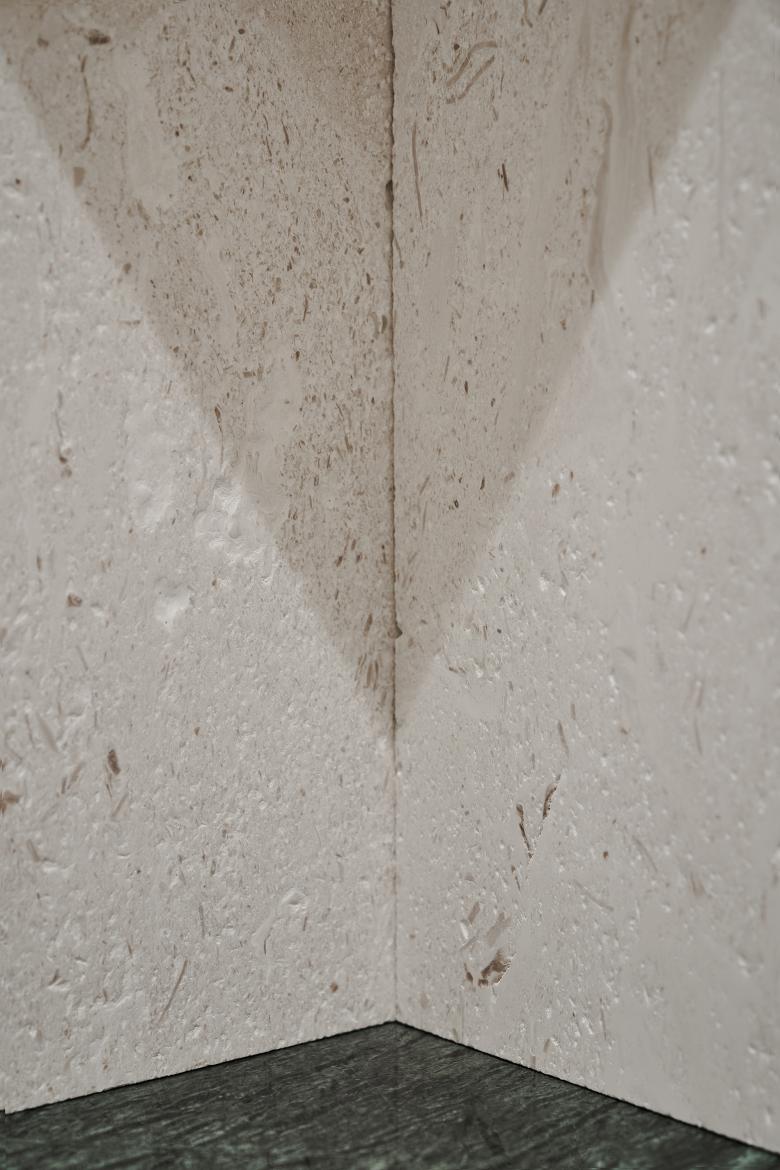 An orderly sense of layering runs through the overall place. Layered structures at different heights guide people's sight lines to provide a comfortable visual experience, and meanwhile turn the originally complicated ceiling system laid with electrical and mechanical pipelines into a feature and highlight of the space. The smooth green stone panels in low saturation forms a subtle balance with the rough pale walls and beams, together adding an elegant yet primitive touch to the space.