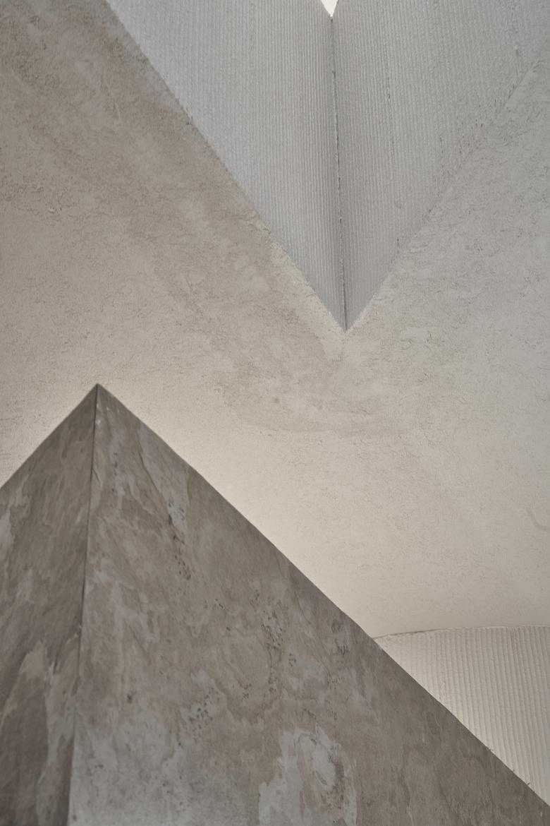 Beams and columns at each layer visually expand the space by fully utilizing height differences. Besides, pipelines and equipment are subtly arranged and hidden in beams and columns, which is a great difficulty of the project. Formal design meets functional requirements, follows a coherent logic, and takes structural aesthetics as expressions, thus producing a space that combines rationality and sensibility. As for the material scheme, rough light-colored textured paint is applied, which recalls the ground paved with beige stones in Europe. In addition, ultra-thin stone veneers of the suspended beams show a textural contrast, and present a solid, rough feeling in soft pale hues.
