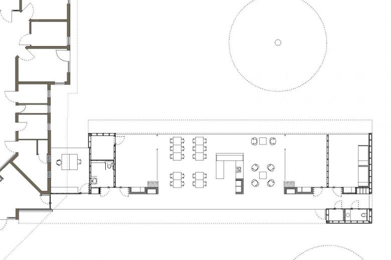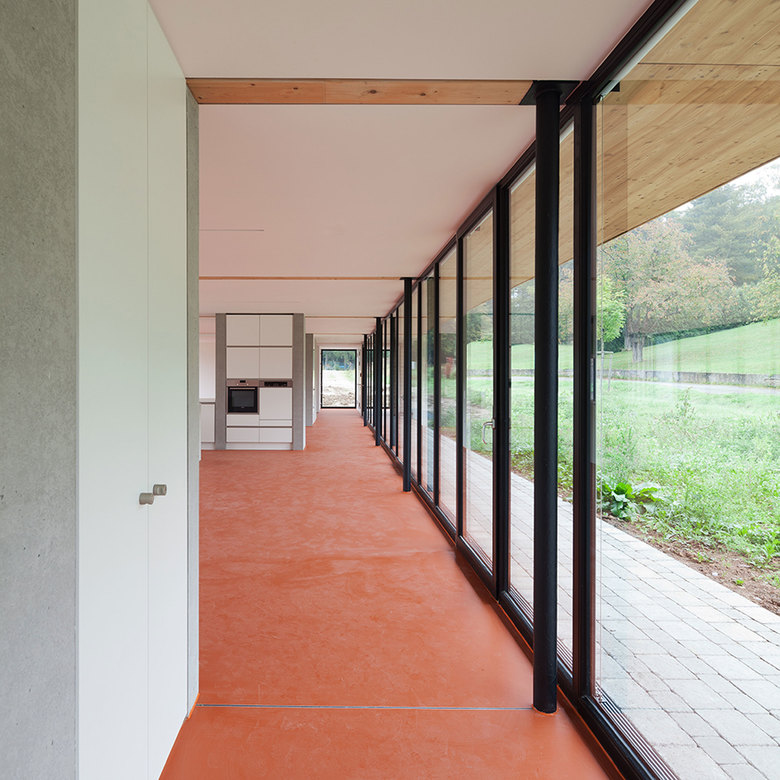 'Beschützend' überspannt ein langgezogenes Dach den offenen Grundriss der Fördereinrichtung zur aktivierenden Tagespflege für die Betreuung von Erwachsenen mit geistigen und teilweise körperlichen Behinderungen als Erweiterung des bestehenden L-förmigen Wohnhauses. Pavillonartig fügt sich der Anbau in den reizvollen Landschaftsraum ein. Das Gebäude lebt von seiner Transparenz zwischen Innen und Außen, Durchblicken und Ausblicken in die Landschaft. Ein reduziertes Material- und Farbkonzept prägt die behagliche Atmosphäre im Inneren.