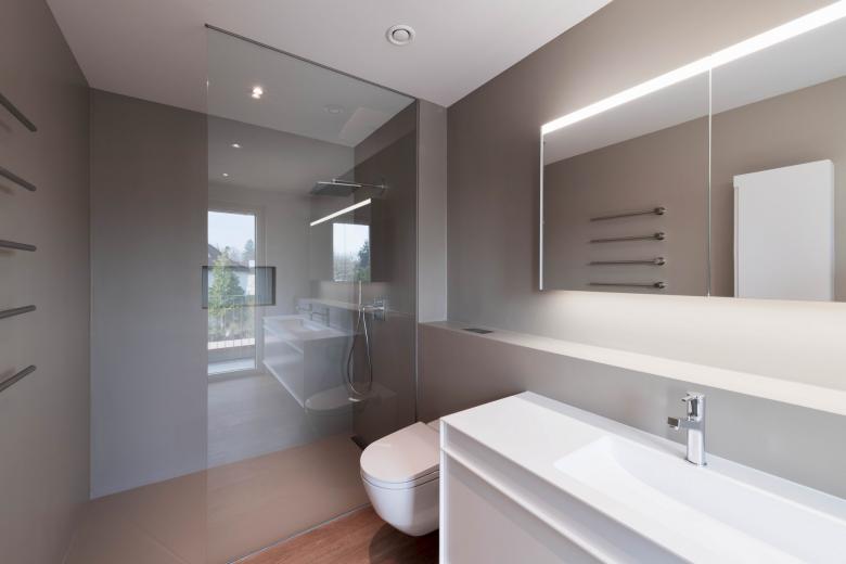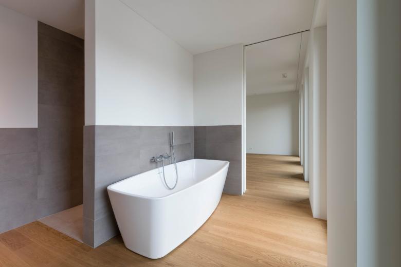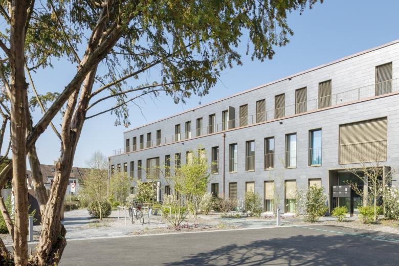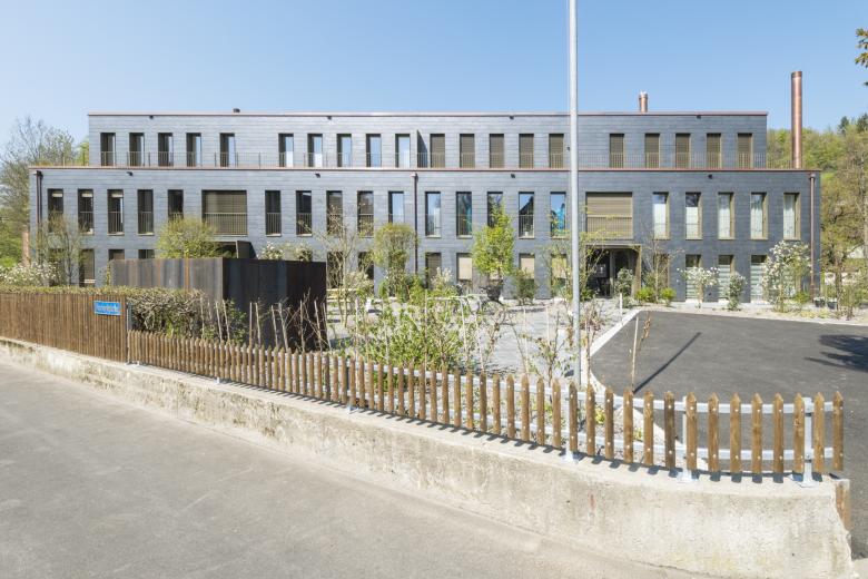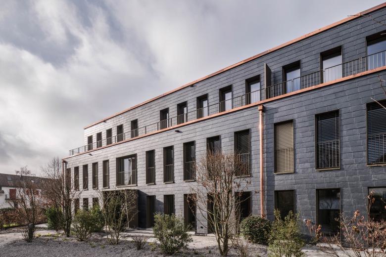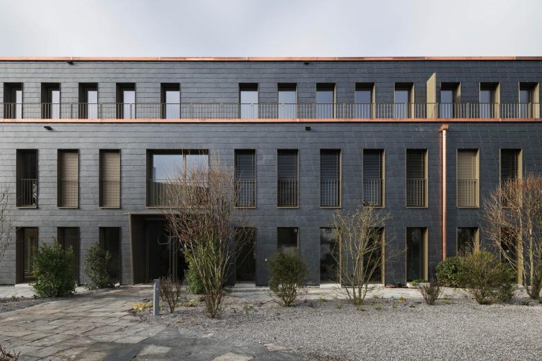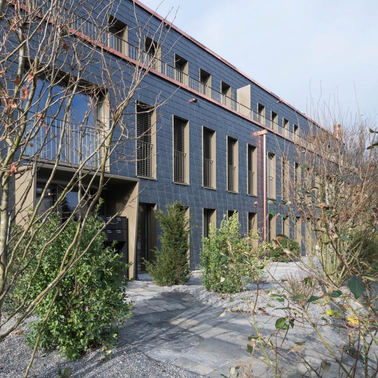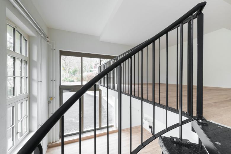 Der Gebäudesockel der ehemaligen Kraftwerkshalle bleibt dabei in seiner originalen Struktur erkennbar. Je nach Witterung und Tageszeit tritt die Fassade des Neubaus aus Naturschiefer zusammen mit den kontrastbildenden bronzefarbigen Metallteilen vielfältig und lebendig in Erscheinung. Die Heizenergie wird mittels einer modernen Anlage aus Erdwärmesonden und Gasabsorptionswärmepumpen zur Verfügung gestellt; Neubau und Bestand verfügen über eine kontrollierte Lüftung. Eine hochwertige Umgebungsgestaltung mit Flächen aus Naturstein und organischen Formen rundet das Gesamtkonzept der neuen Liegenschaft ab.