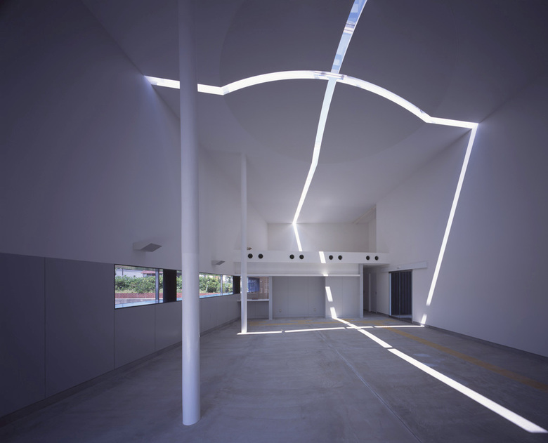 待合ホールの空間はこの建築の最も主要な部分であり、<明石・子午線・天文台>という与条件を空間化しようと試みた。単純な、閉じた箱である建物には二種類の開口だけがある。一つはいうまでもなく、建物の軸とずれてはいるが、正確に南北軸を表示するよう穿たれた天井の十字形のスリットであり、入ってくる光は日時計として時を刻むと同時に、天井の微かなドーム状の形態と共に、この場所が子午線上にあることを表象している。天井をドーム状としたのは、床や壁に落ちる光がきれいな十字形ではなくノイズのある歪んだものとしたかったためでもあり、それは光が十字架のように象徴的過ぎる形態となるのではなく、あくまでも日時計としてあって欲しいと考えたからだ。