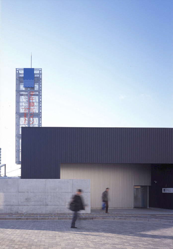 このターミナルを構成するもう一つの空間、通路部分は待合ホールとはまったく異なっている。露出した型鋼のフレームに取り付けられたアルミ型材ルーバーと型板ガラスの開口、テントの屋根など、すべてどこかで見たことがあるような既製の工業製品を使用することで、そっけない「即物的」な空間としたかった。外に対して閉じた空間である待合ホールを抜けると、再び通り抜けてきた現実の都市とこれから乗り出して行くはずの「海」とが同時に目に入ること、それも実にあっけなく、というのが設計の意図である。