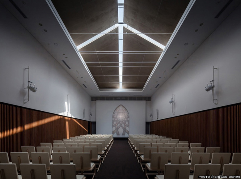 南棟は鉄骨造の6階建ての中層の建物とし、大都市郊外のスケールに対応させ、ファサードの外部側はプロフィリットガラス、室内側には透明ガラスを用いたダブルスキン構造を採用し、前面道路の喧噪から守られた静かな室内環境を確保することに留意した。南棟には講堂を始めとする集会のための諸室を配するが、その全てにそれぞれの目的に合わせた形で外部の自然光や緑を導入し、都市の喧噪の真只中に居ながらも自然を身近に感じ静粛に満ちた空間を実現した。