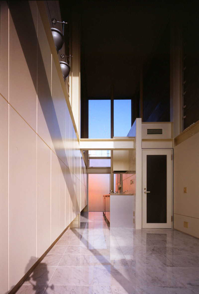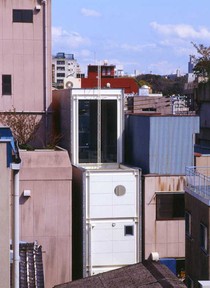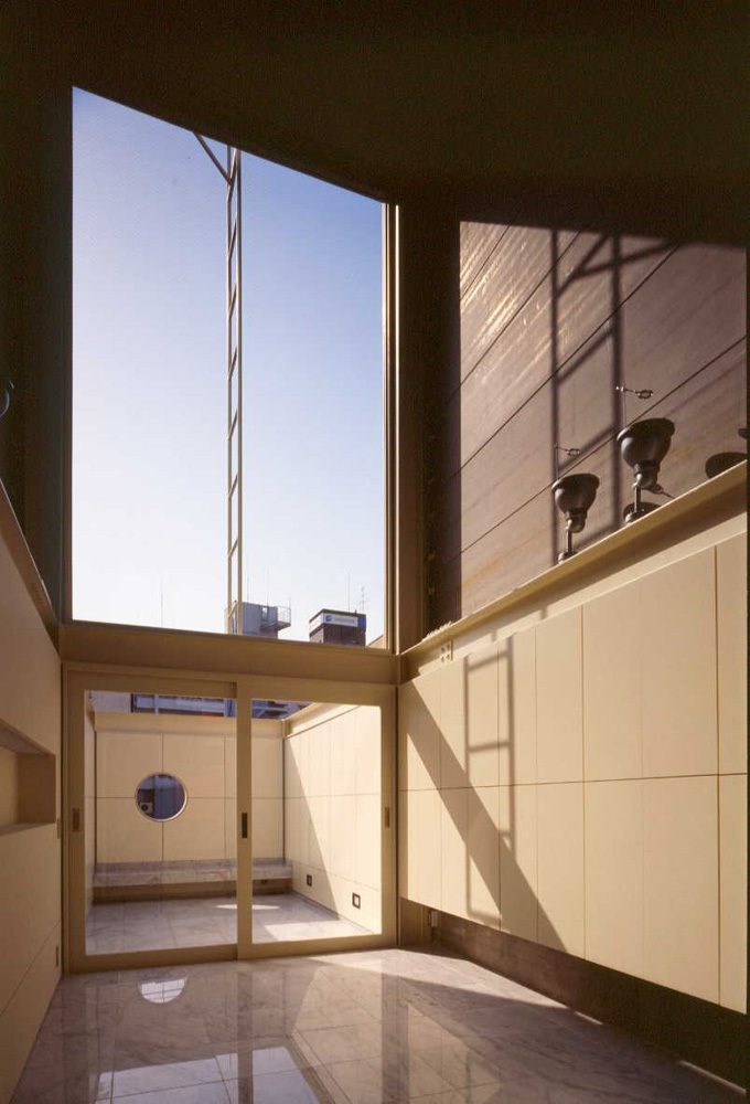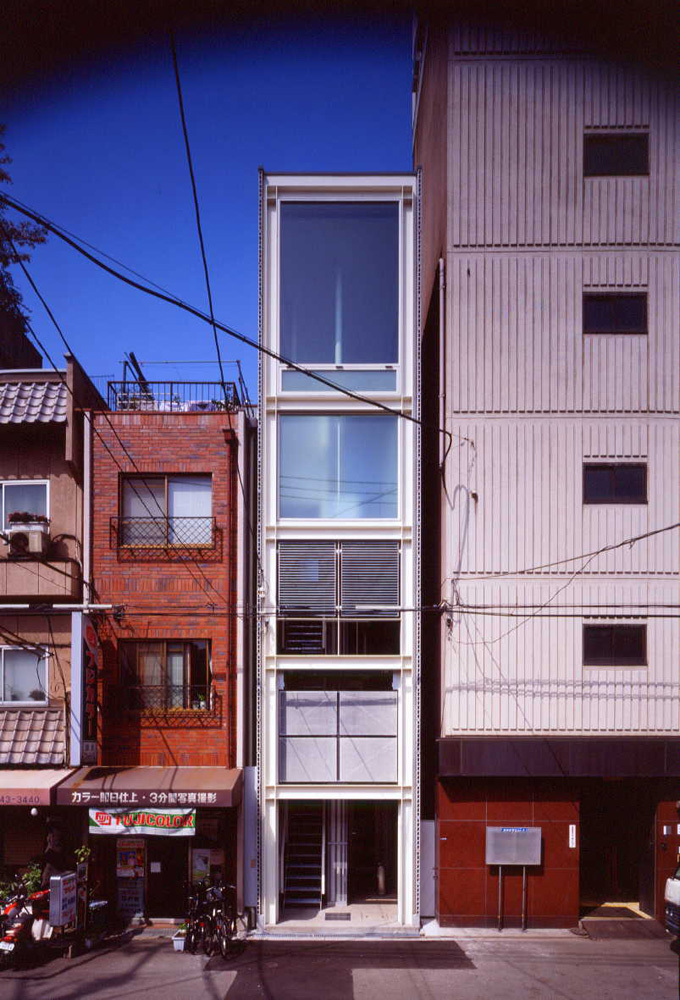 「日本橋の家」は大阪の下町、極小の敷地に建つ住宅である。敷地一杯の間口2.5m、奥行13mの建物の1階から3階までの階高は可能な限り低く抑え、逆に最上階は建物全体の約2/3を天井高6mのダイニング・ルームとし、残りの奥1/3をテラス、屋外空間としている。その結果この建物は間口の狭い敷地の奥行き方向と同時に、垂直方向にも延びてゆく空間を持つことになった。都市での生活を垂直方向に展開すること、そしてたった数㎡しかないテラスと、ダイニング・ルームを含めてもせいぜい30㎡に過ぎない空間ではあるが、最上階に地上の喧騒から隔絶されて浮遊する生活空間を持ち、しかもそれが自然に接したものであること、というのがこの住宅の主題であり、それは屋上庭園という形式を見直してみたい、という試行の結果でもあった。