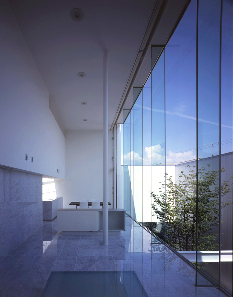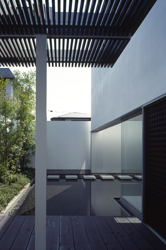 この住宅の中庭では「自然」をそれとは違った形で導入したいと考えた。そこにあるのは一本の樹と、抽象的な水平面としての水だけだ。飼い慣らされた自然である「坪庭」には我々は入ることが出来るが、この住宅にとっての「自然」