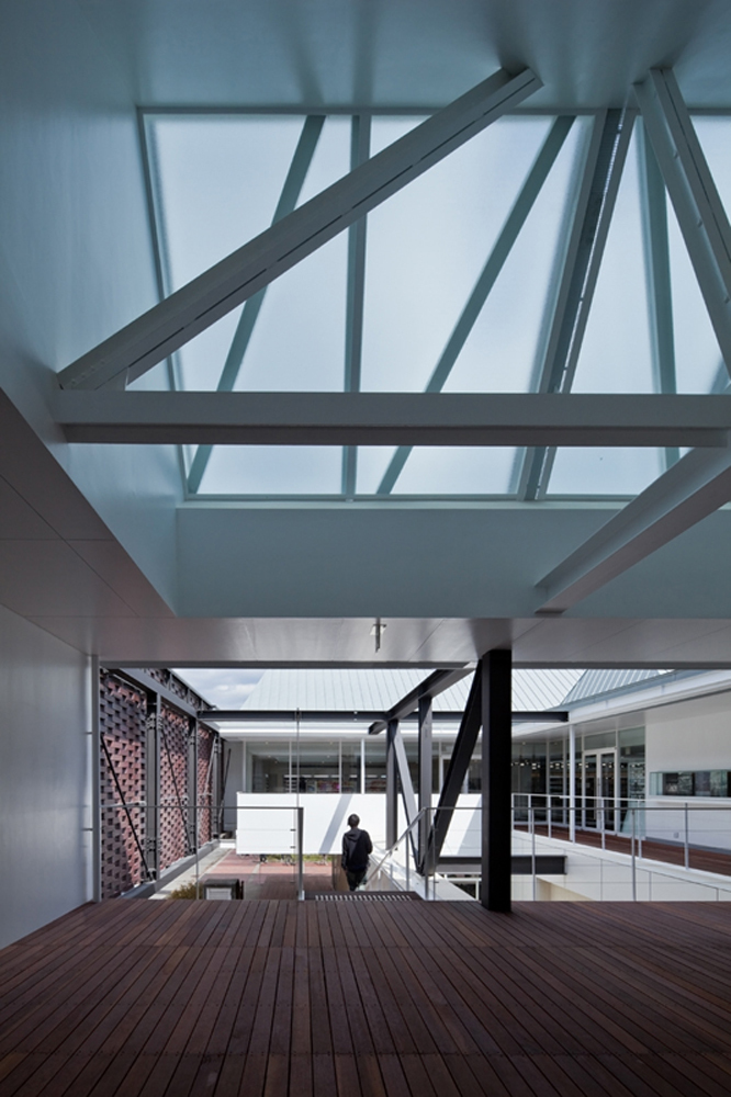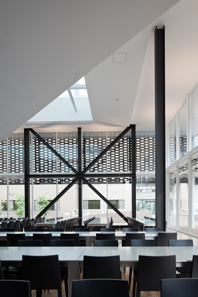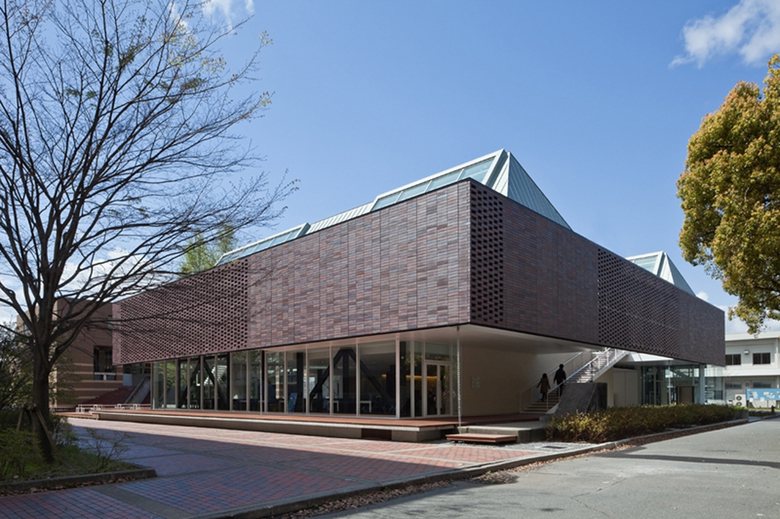 同時に現代の建築としての軽快さを表現するため、煉瓦壁は2階のみに使用し、1階はピロティやガラスでキャンパスに開くこととする。また2階の煉瓦壁も場所によっては煉瓦を格子状に抜き取り、煉瓦の半透明壁越しに外部へと向かう視線を導入することとし、煉瓦による外壁であるにもかかわらず、キャンパスに開いた表現の可能性を模索した。
