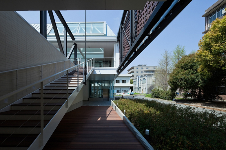 キャンパスに収まっている矩形の2階建の建物、その2階のボリュームは北側構内道路にキャンティレバーで飛び出すことで、下部のピロティをこの建物への屋外アプローチ空間とし、緩やかな屋外階段はそこから2階の外部テラスへと繋がる。それらの屋外空間の連なり、1階のピロティや2階に設けた外部テラスが北側道路とのバッファとなり、キャンパスとの程よい距離をつくり出そうとした。