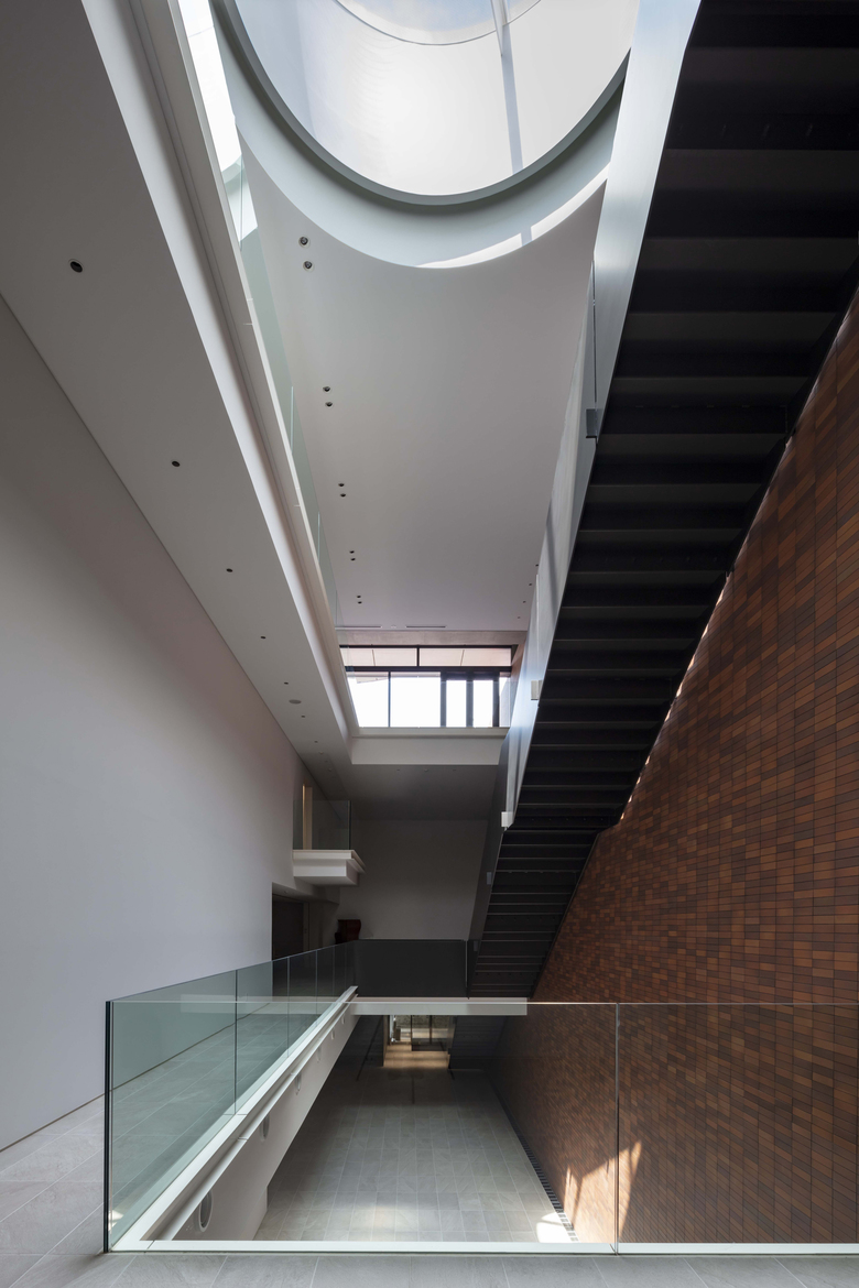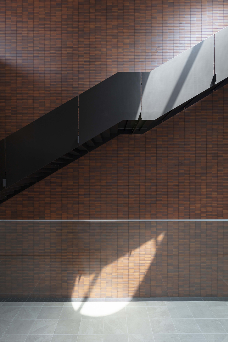 下階レベルから上階レベルまでを繋ぐ階段は内部空間4層を垂直に繋げる壁面に沿っており、その壁面を旧望天館のものに限りなく近い煉瓦タイルとし、導線をそれに沿って上を見上げながら登る一本の階段とすることで、旧望天館の煉瓦タイルの外壁とそれを見上げるような擁壁の存在というこの場所の二つの記憶をその同じ場所に残そうと考えた。