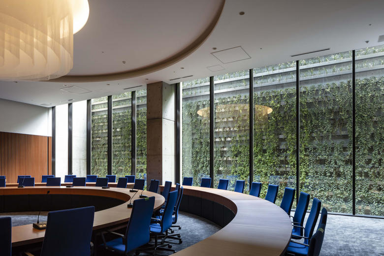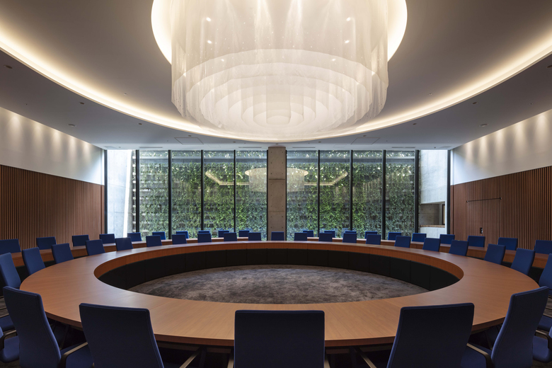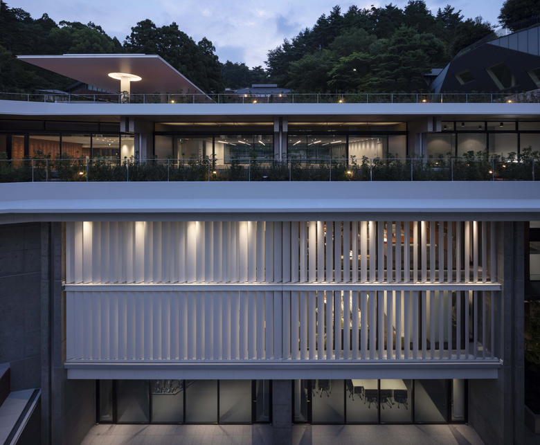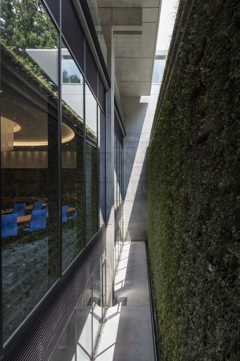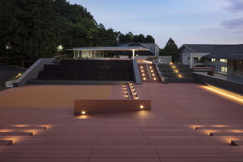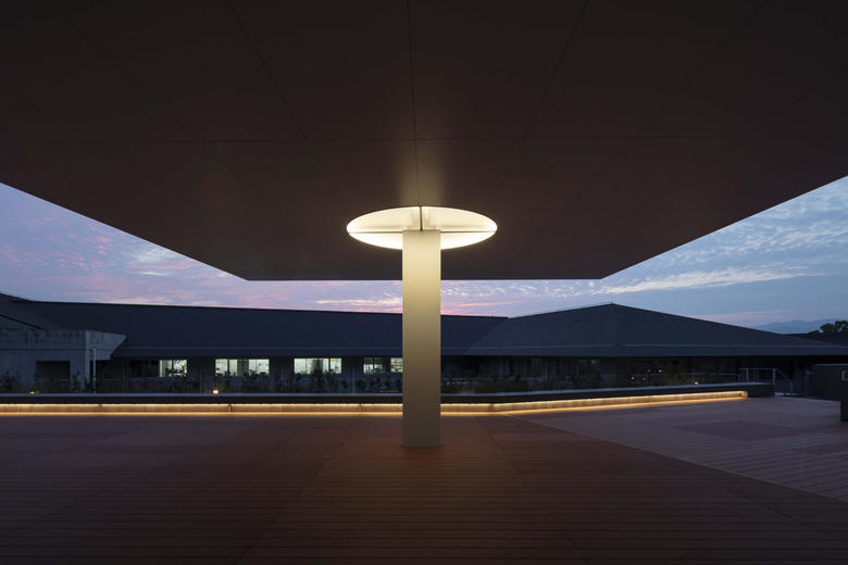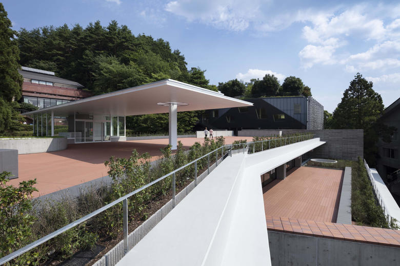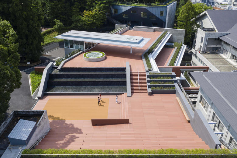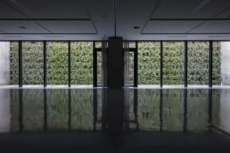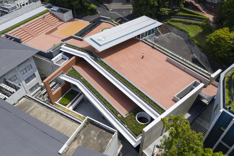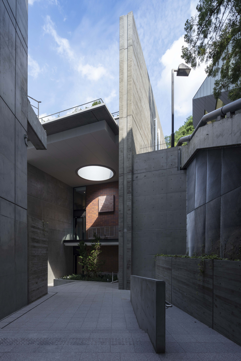 基本的には地下部分が3層、地上部分が1層の建築であるが、下のアプローチレベルからは最上階をセットバックさせることで可能な限り空に開いたアプローチとする。また屋上階ではギャラリー棟の屋上を広場として再生すると同時に一層上の屋上広場へと階段と水盤で繋ぐ。これまではこのキャンパスには無かった水平に視界の拡がる空中庭園としての広場をこの場所に提供する。