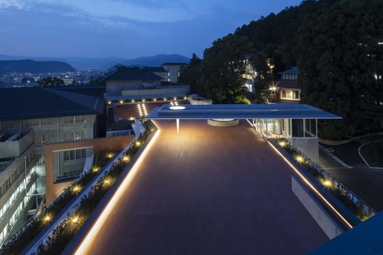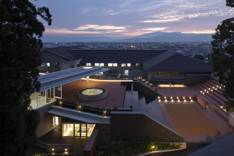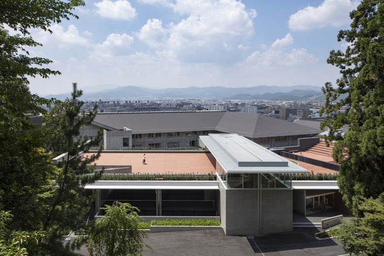 旧望天館は京都東山三十六峰の一つである瓜生山山麓の斜面に拡がる大学キャンパスの中央、高さ約10m弱の擁壁の上に建っていたが、今回の計画はその擁壁部分そのものを建築化し、屋上を空中庭園化することで南に建つ校舎棟の2階と北に建つギャラリー棟の屋上とを繋げ、緑の斜面地のキャンパスに新しい広場を創り出すこと、また擁壁が存在していた時代には上下に切断していた人の導線を新しく繋ぐような建築とすることが主題だった。
