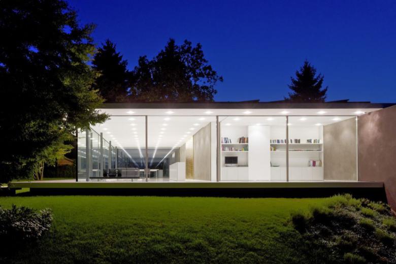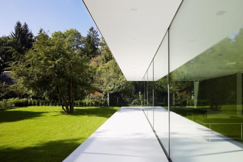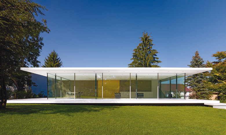 D10 ist ein eingeschossiges Einfamilienhaus in einem gewachsenen Wohngebiet in der Nähe von Ulm, das über einen privaten Zufahrtsweg erschlossen wird. Prägende Elemente des Gebäudes sind zwei parallele Wandscheiben. Der Raumabschluss erfolgt durch eine großzügige Verglasung. Eine umlaufende, großzügige Terrasse, geschützt durch das weit auskragende Flachdach, verbindet Innen- und Außenraum. Über diese Terrasse wird das Gebäude auch betreten.
