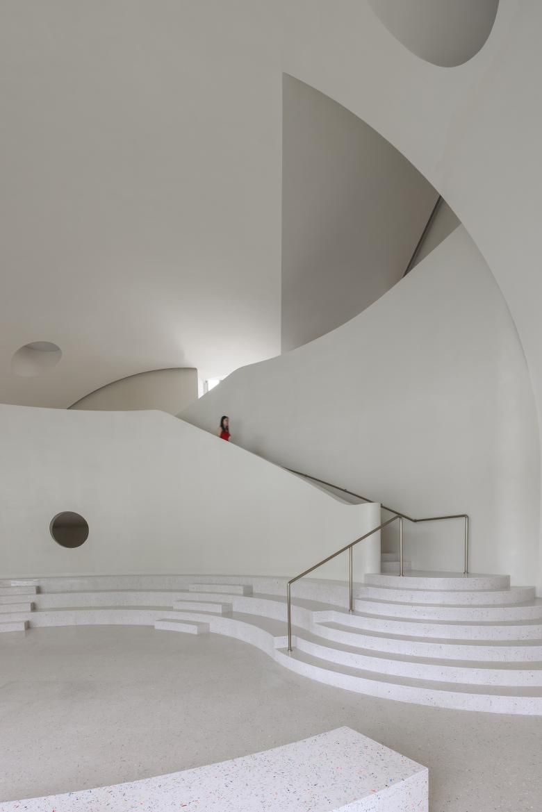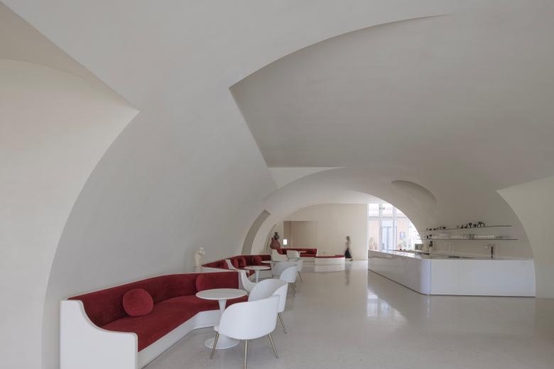 The cave and arched lobby, the mountain path and outdoor stairs, the sun and glass round windows, the entrance and skylight, the membrane structure and tree shade, the water channel and landscaping, the sea and pool, the beach and ground, the cliff and platform—all these natural elements, after being abstracted, combine with architectural components to form a set of intertextual texts, creating a super intertextual relationship between the art center and the mountain. Through interpreting these texts, one can discover history, myths, memories, nature, symbols, riddles, and even the architectural language model.