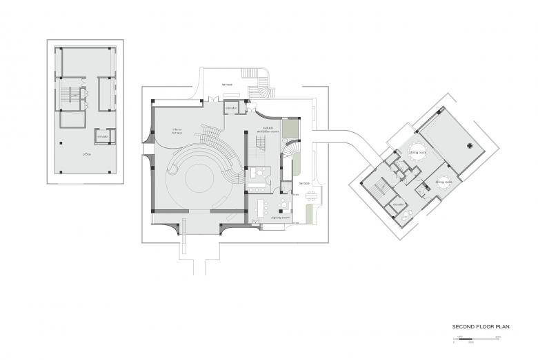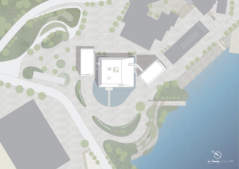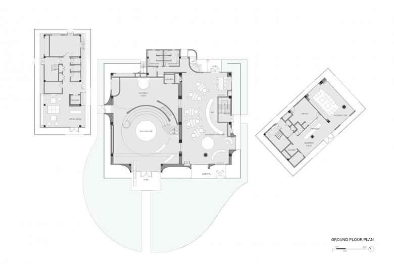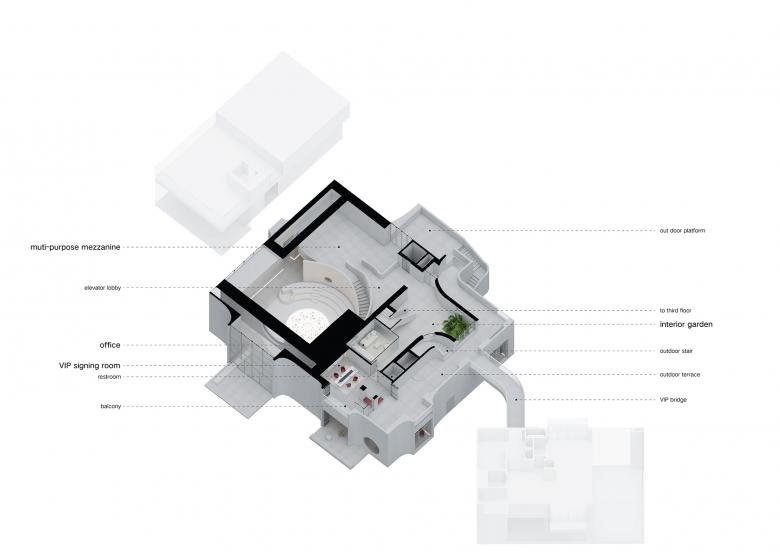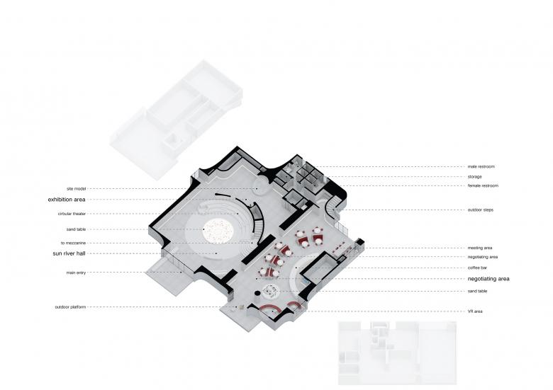 Among the three buildings in the original plan, the east and west auxiliary buildings serve as reception and office areas, while the central main building is the core of the art center. The east and west auxiliary buildings are the secondary mountains, and the main building is the primary mountain. The sea is created in front of the main mountain. Walking along the boardwalk on the sea, one enters the main mountain’s lobby. The sea also flows into the lobby like a tide. Inside the lobby, there are two routes to climb the mountain. One route heads east, first entering the coffee reception area, passing through the open negotiating area, reaching the second-floor overseas Chinese exhibition area, and then arriving at the outdoor seating area. Here, a sky bridge connects to the secondary mountain, and then an outdoor staircase leads to the third-floor multi-functional hall’s external platform. Another route climbs the large steps to the mezzanine, then to the second floor, or takes the elevator directly to the third floor. After passing through the multi-functional hall, this route merges with the first one at the platform, and both continue up the outdoor stairs to the roof, where a hidden small coffee garden offers a panoramic view of the entire town.