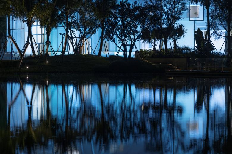 During the day, the white Flickering Peak reflects in the white pool, naturally acquiring a sense of sanctity. Gemini architects are fascinated by the transformation of this immediate sanctity. So, I invited lighting designers to create the other side of sanctity in twilight—materiality, temporary materiality. The translucent Flickering Peak transforms into a mountain of lights in different colors, symbolizing different yet rich desires.