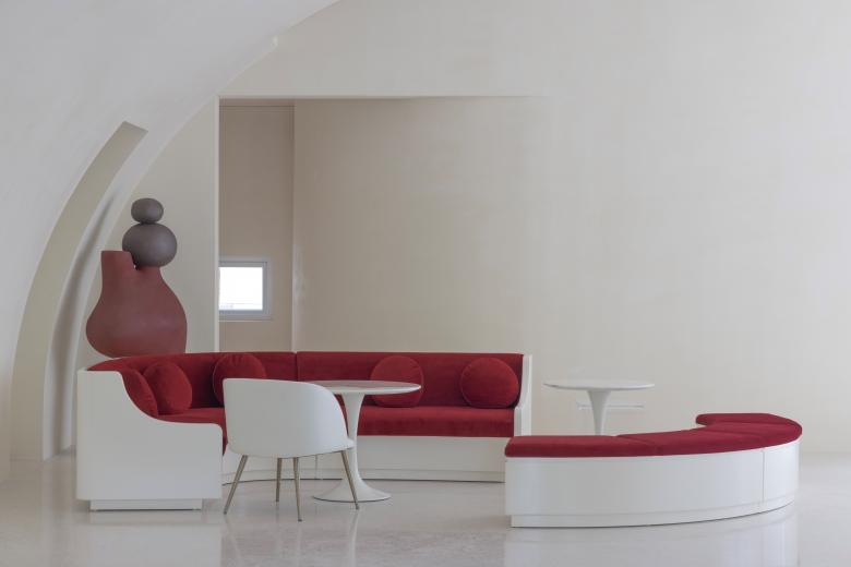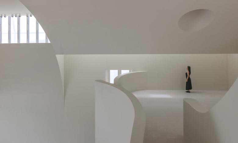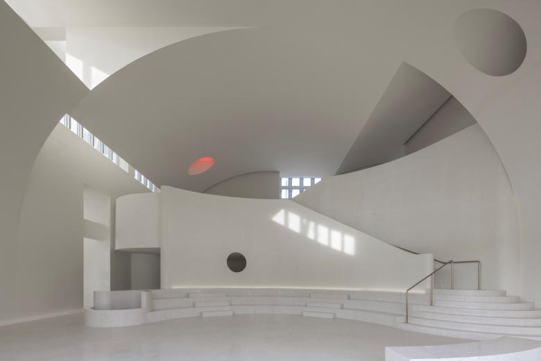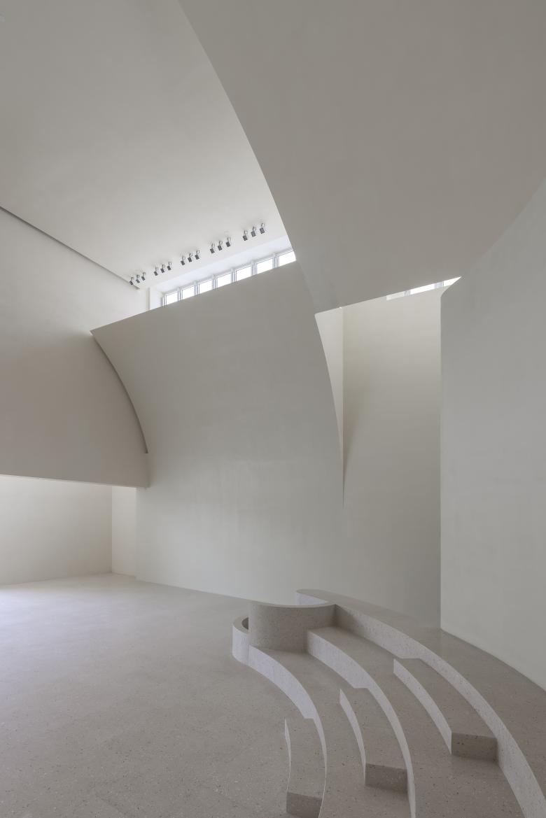 However, inside the main mountain’s lobby, there will be a highly saturated lighting design. Under a blue background, the red sun shines, and at this moment, it is the resurrection of Rothko. At this moment, behind the ever-changing materiality seen from outside, an immediate sanctity different from pure white is born.