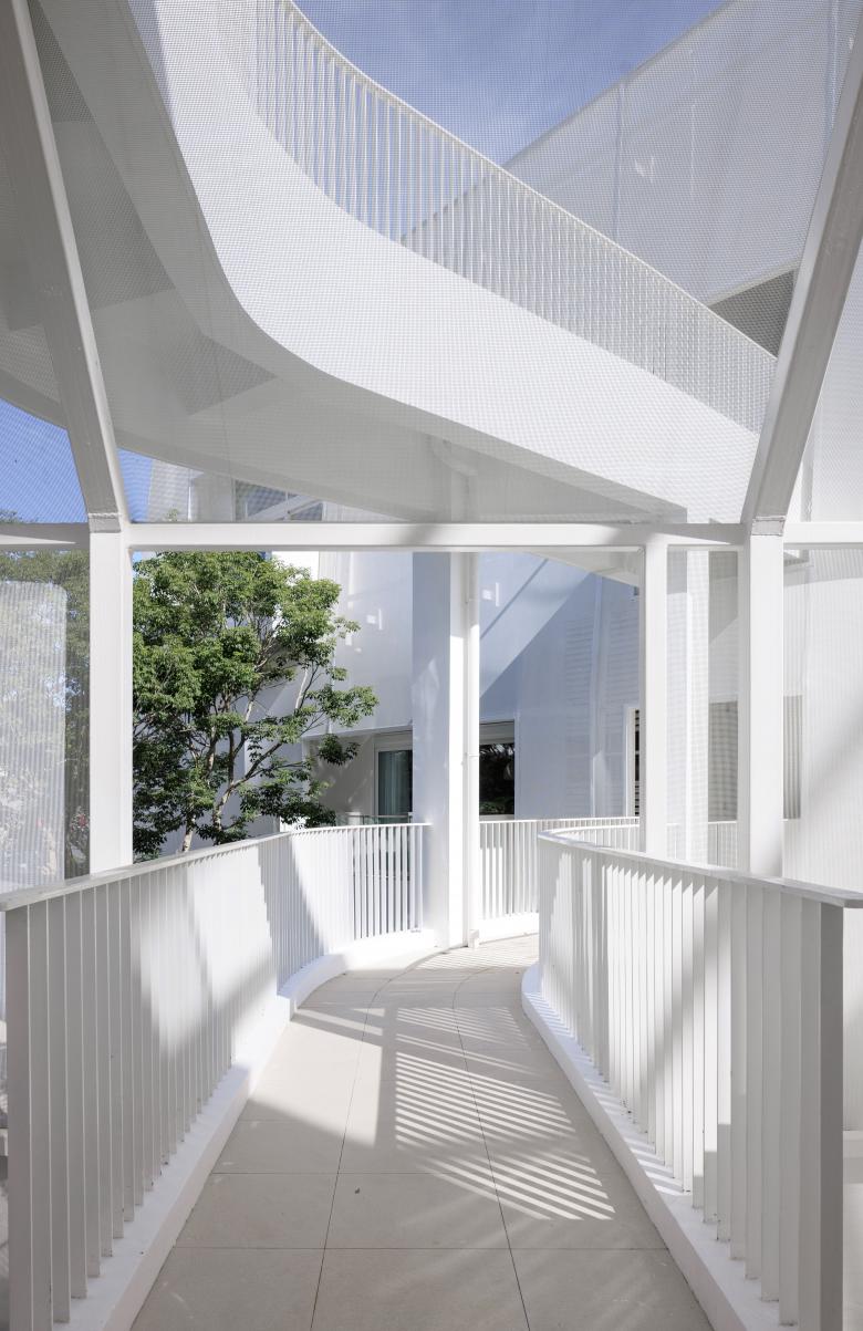 Due to structural load restrictions, I used lightweight membranes instead of the commonly used perforated aluminum panels. The Ferrari membranes with three different perforation rates gradually increase in transparency from bottom to top, forming a translucent visual boundary resembling mountain peaks. Under the scorching sunlight of Hainan, this creates a flickering effect on the roof, which is the origin of the name "flickering."