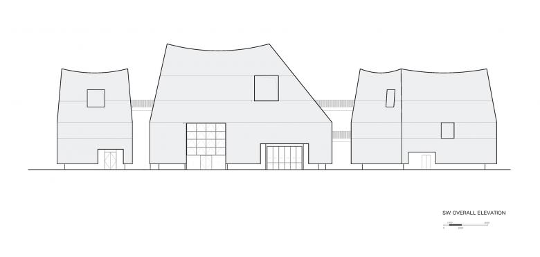 The terraced main building, combined with the auxiliary buildings based on their functions, is visually inconsistent and can easily be overshadowed by the cluster of buildings developed in the background. I decided to make an addition by covering each of the three buildings with a semi-transparent shell. These three shells can break free from the functional facades of the three buildings and independently shape abstracted mountain peaks. This ultimately achieves the effect of highlighting through subtraction in a complex background.