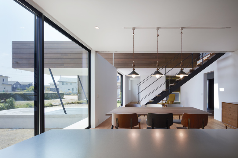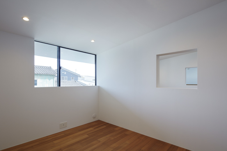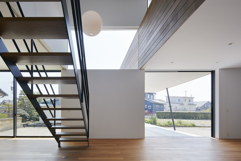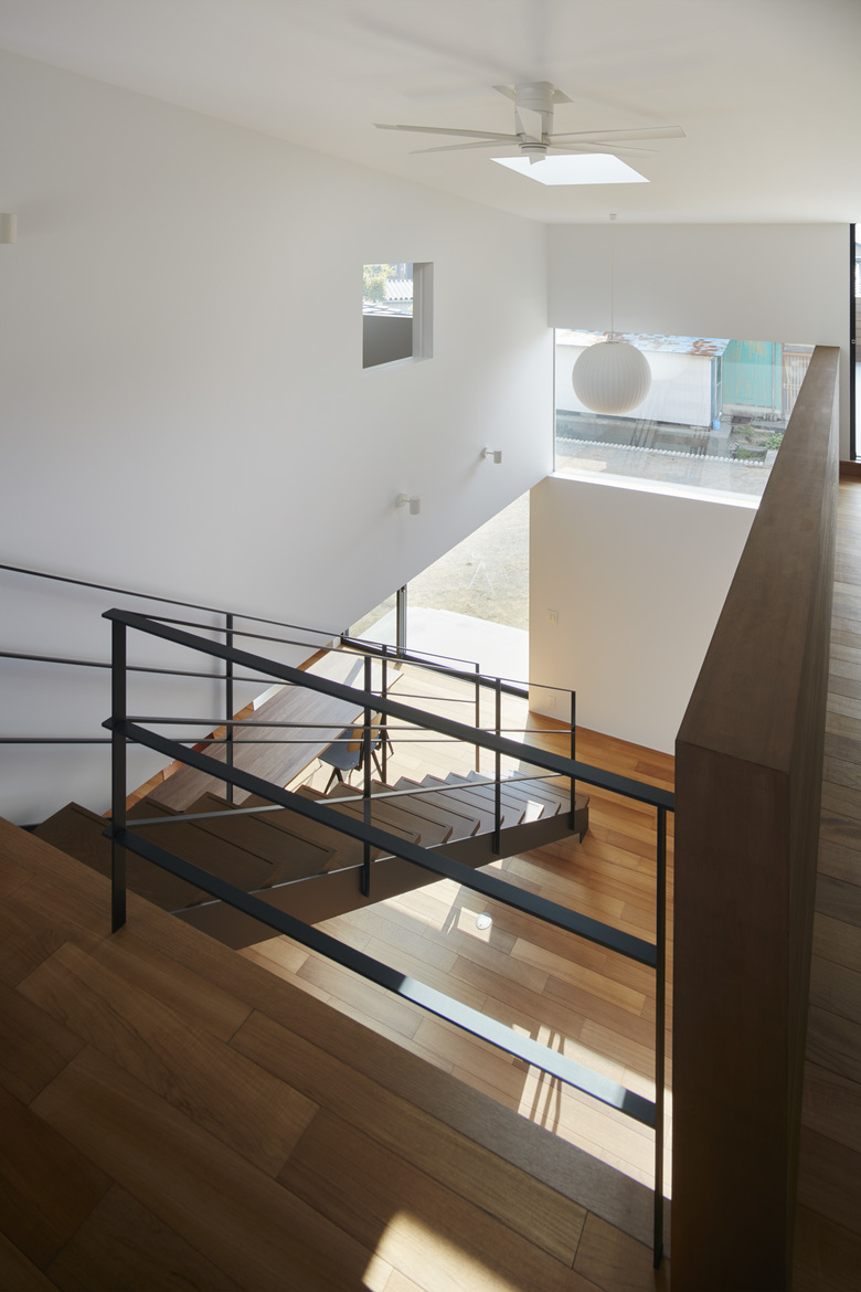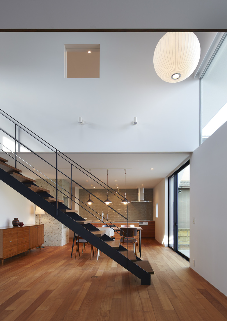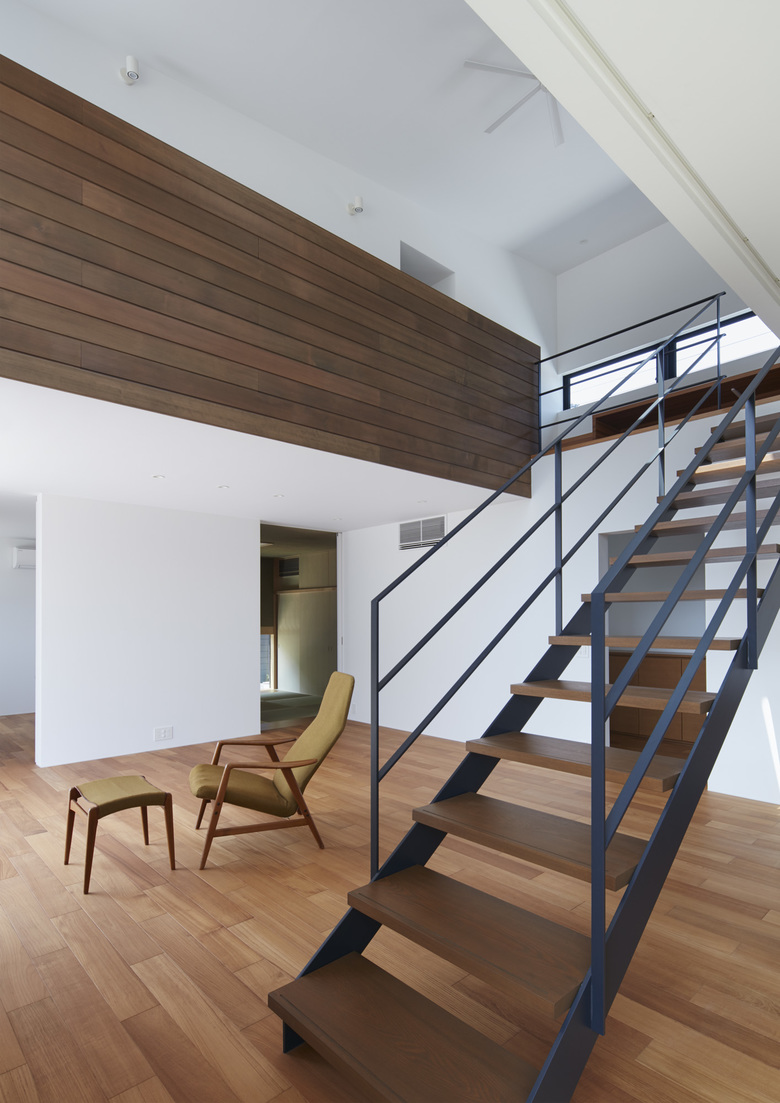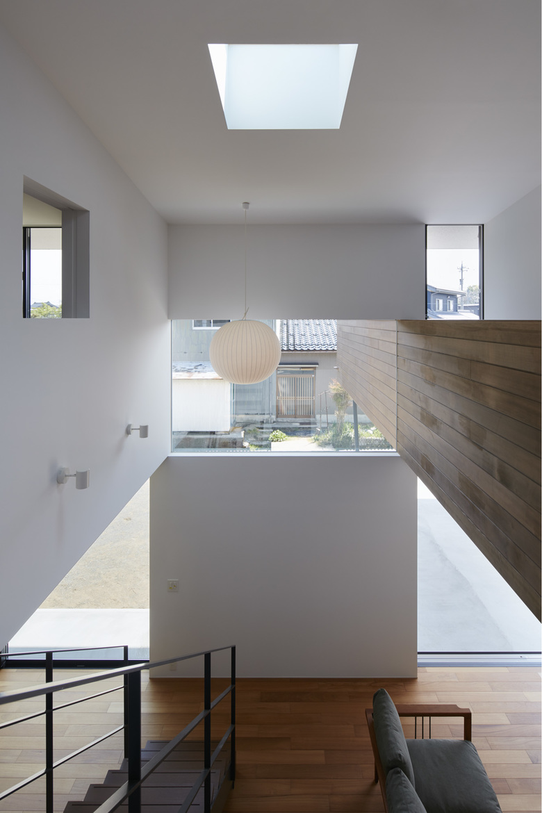 We proposed a building style that would provide a blank space for the surrounding site, where large houses are built all over the site. In response to the request for a house that allows sunlight to enter the house, the plan shape was extended in an east-west direction to allow for a large frontage on the south side. Although it is a simple structure, the way of making openings on the south side was devised to create spaces with different atmospheres depending on the location. This relatively compact rectangular building is placed in the center of the site, with a garden to the north and south, which is divided into two sections to the east and west. These four gardens not only add richness to the house, but also provide a sense of space and greenery to the surrounding environment.