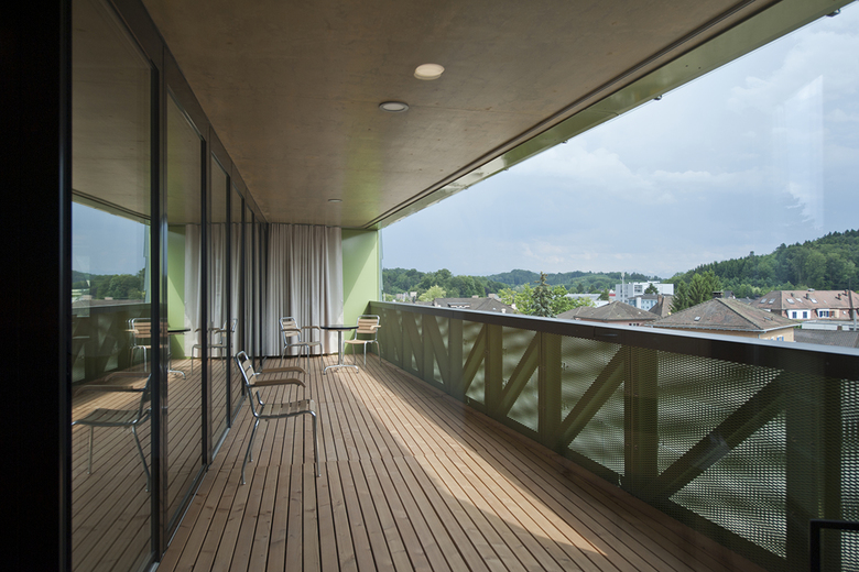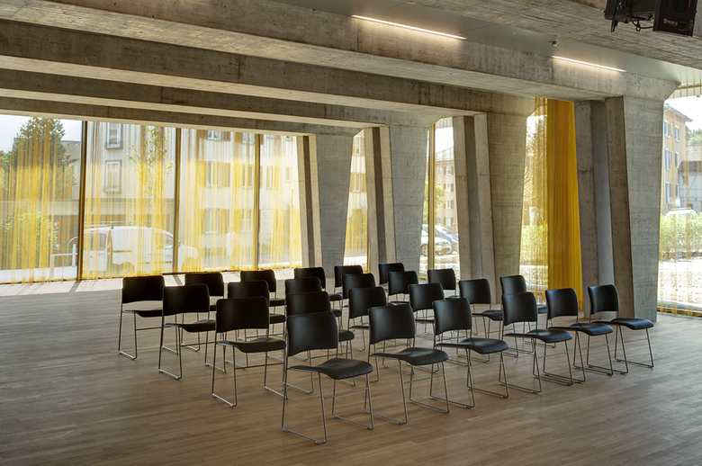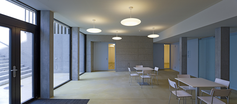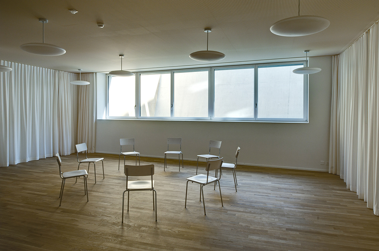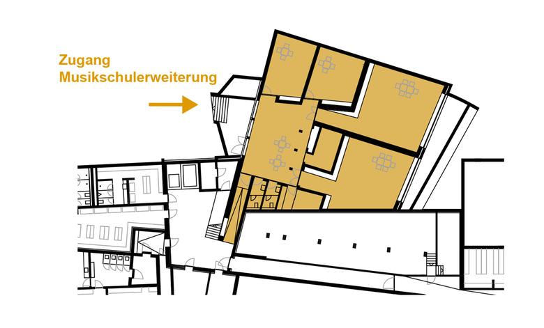 Ein grosszügiger Zugang in direkter Verbindung mit der bestehenden Musikschule bringt Licht in das Foyer, das auch für Veranstaltungen genutzt werden kann. Durch sorgfältig geplante Lichtführung, Materialisierung und Farbgebung zeigen sich die neuen Räume als angenehme und qualitätsvolle Übungs-, Aufenthalts – und Veranstaltungsorte.